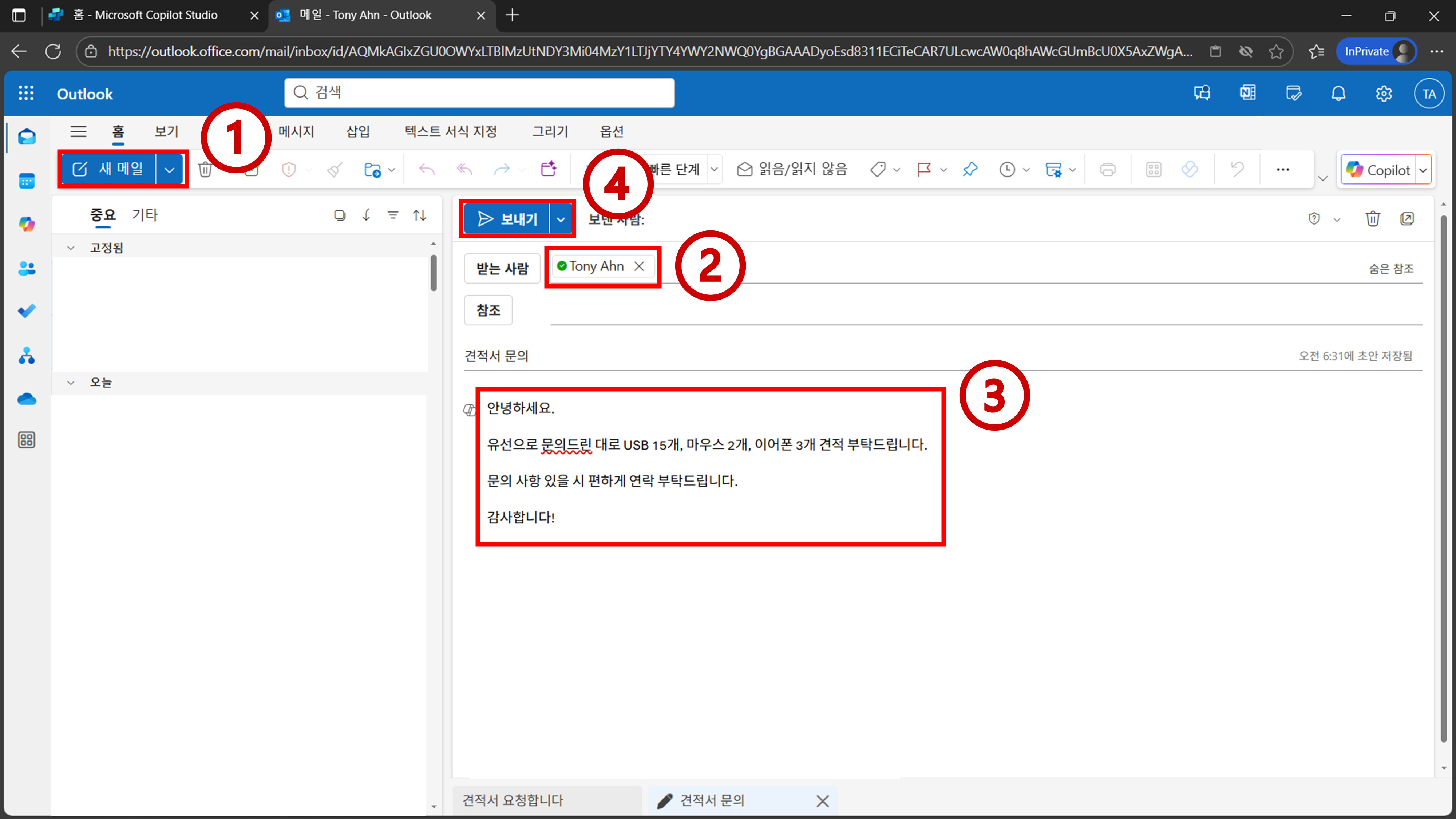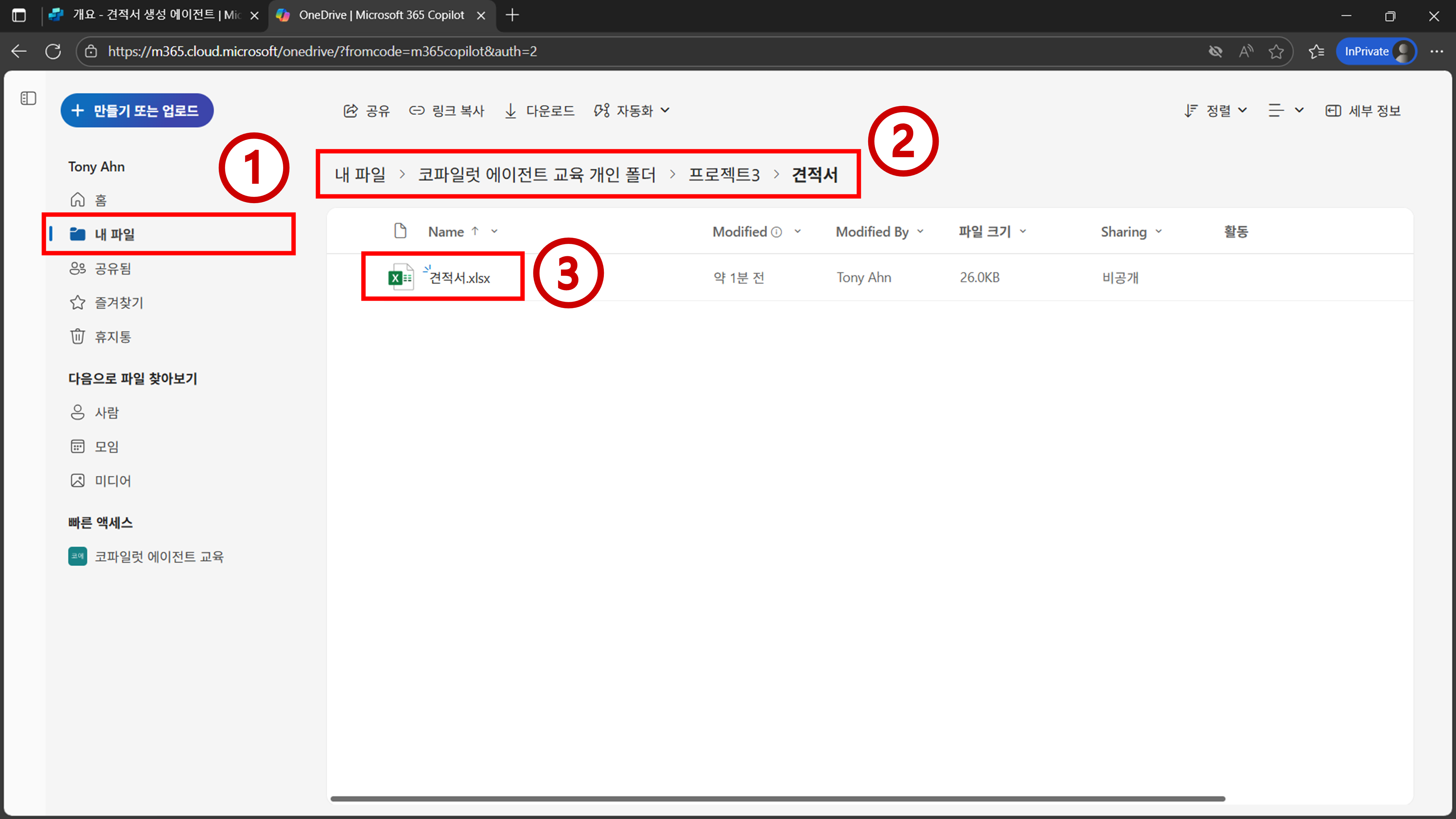 내 파일 > 코파일럿 에이전트 교육 개인 폴더 > 프로젝트 > 견적서로 이동하면견적서.xlsx파일이 새롭게 생성된 것을 확인할 수 있다.이메일에서 요청한 품목 및 품목별 개수가 적절하게 입력된 것을 확인할 수 있고, 각 품목별 단가 또한