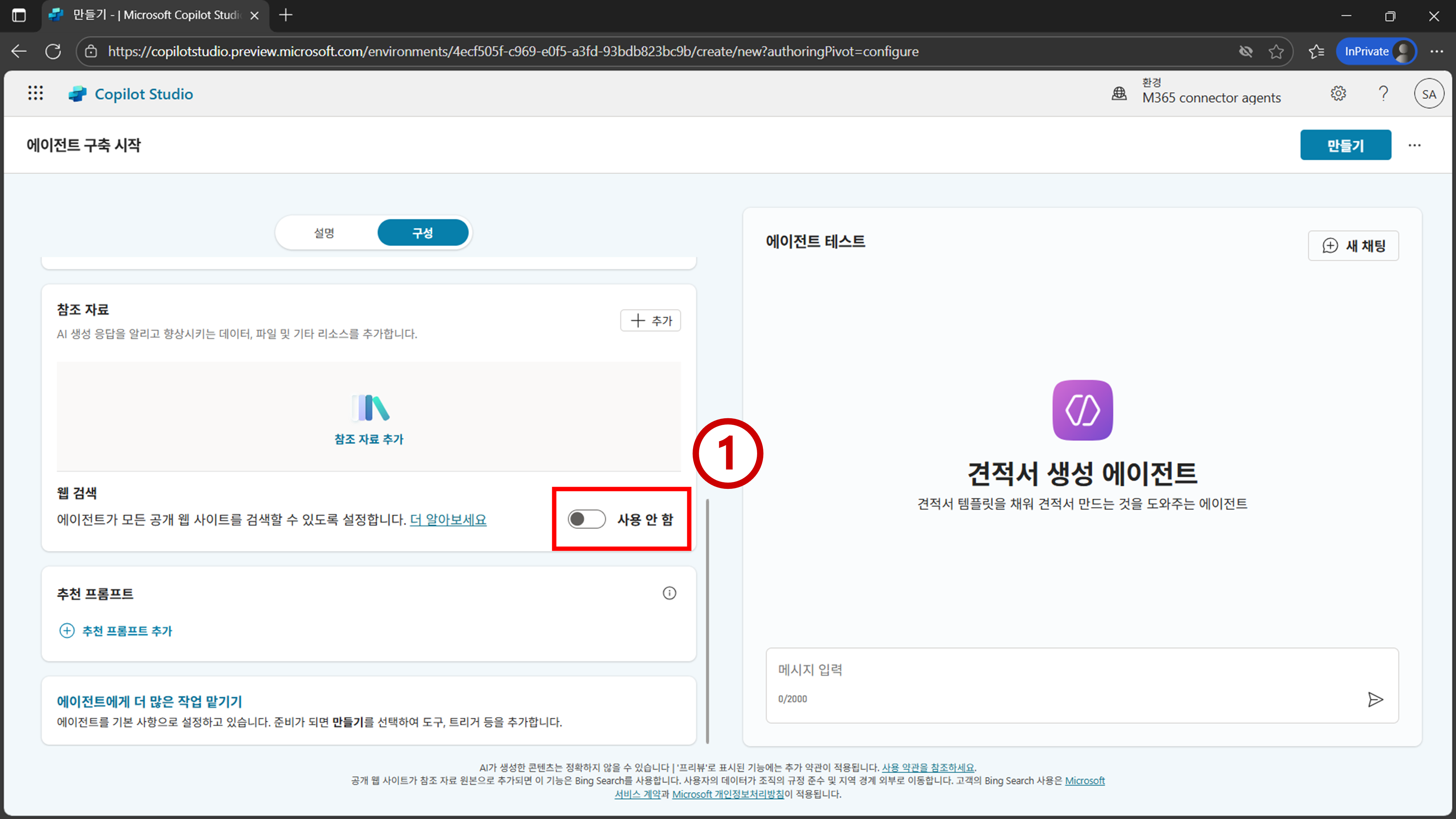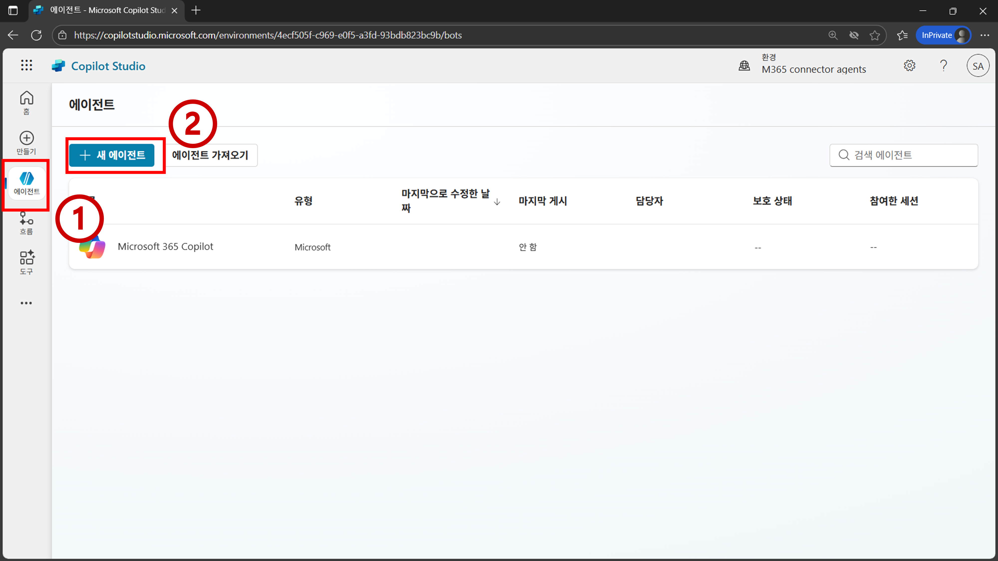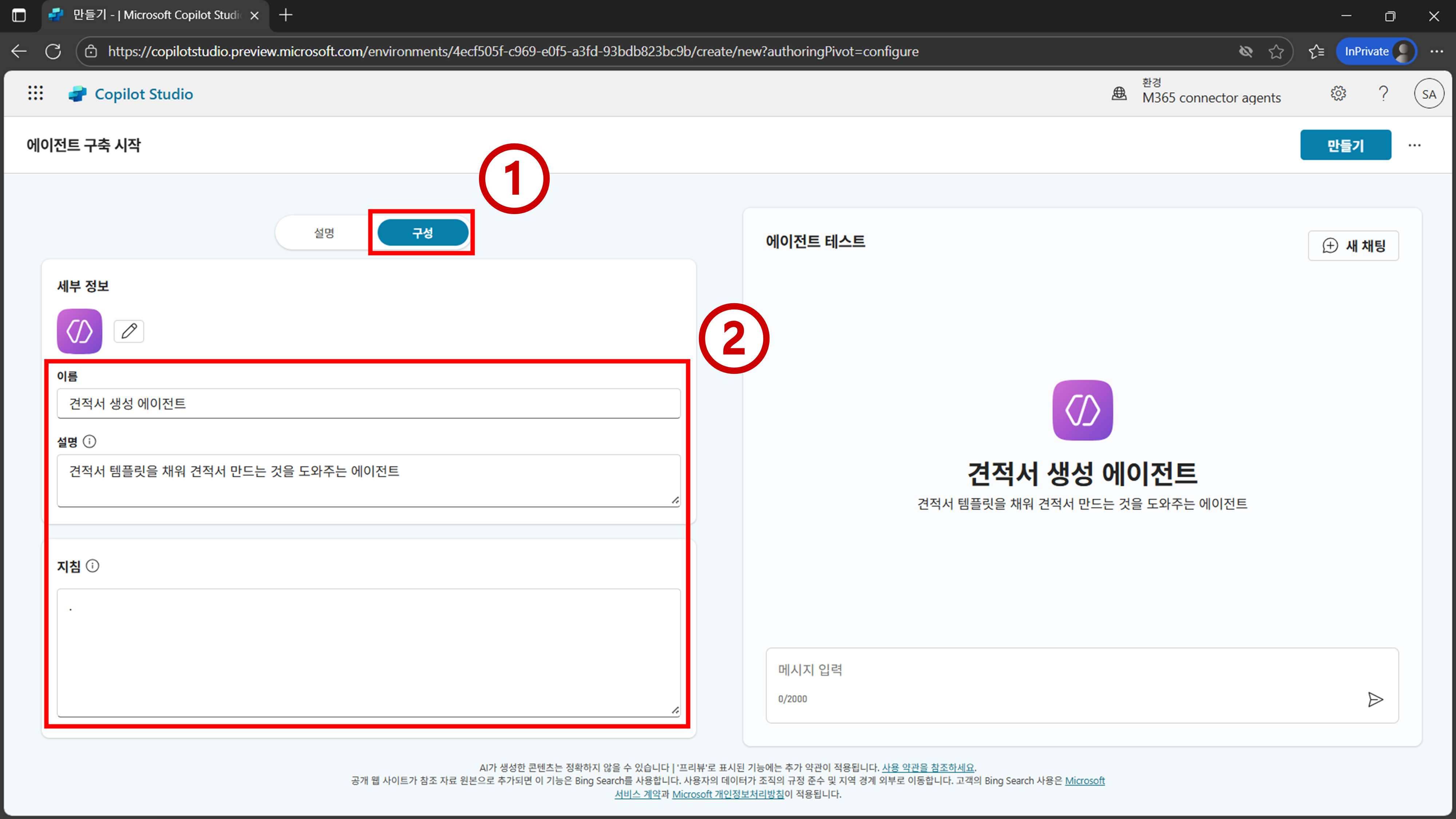 https://copilotstudio.microsoft.com/로 이동하여에이전트 > 새 에이전트를 클릭한다.구성을 클릭한 뒤 에이전트의 메타데이터를 아래와 같이 설정한다