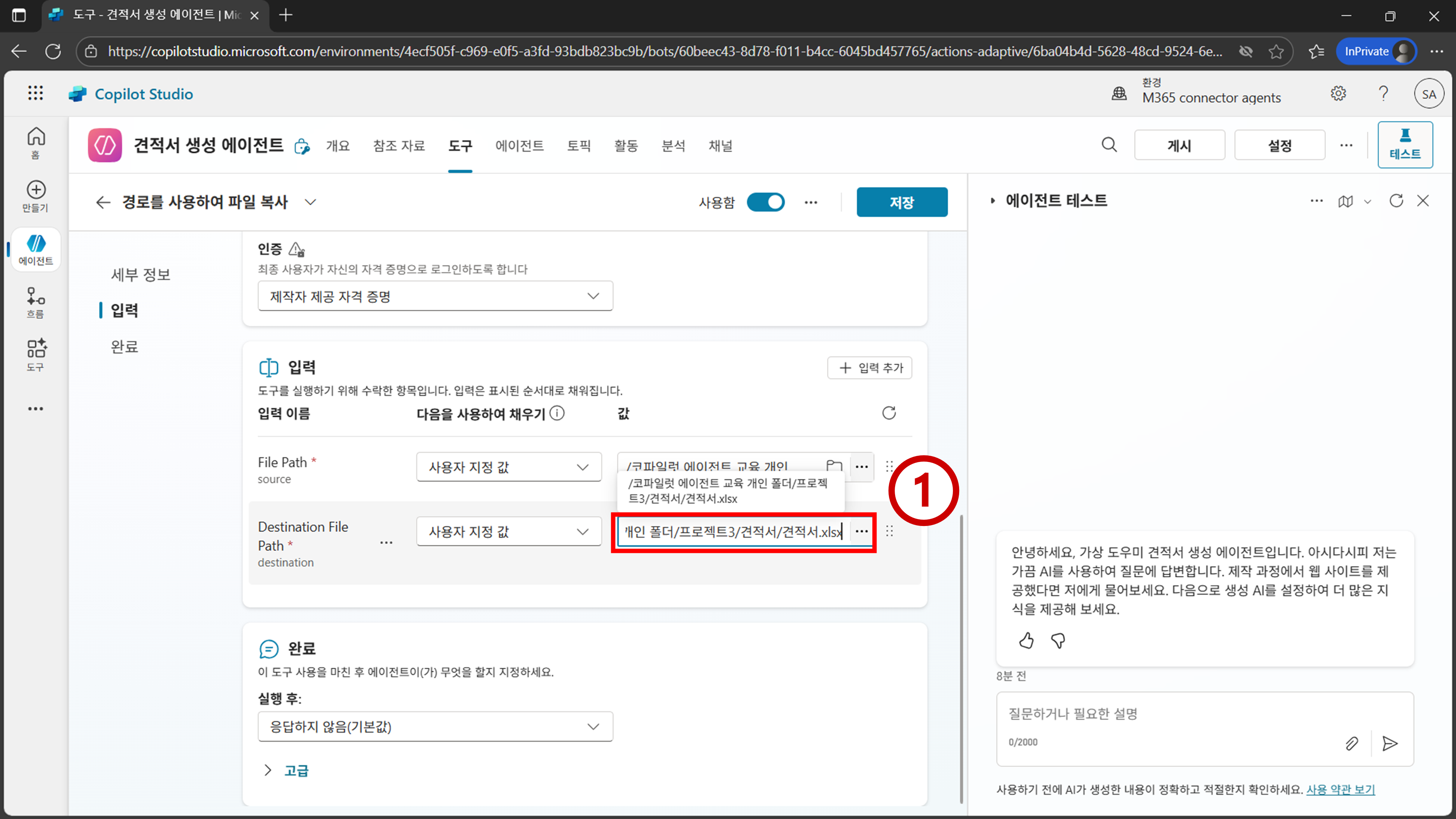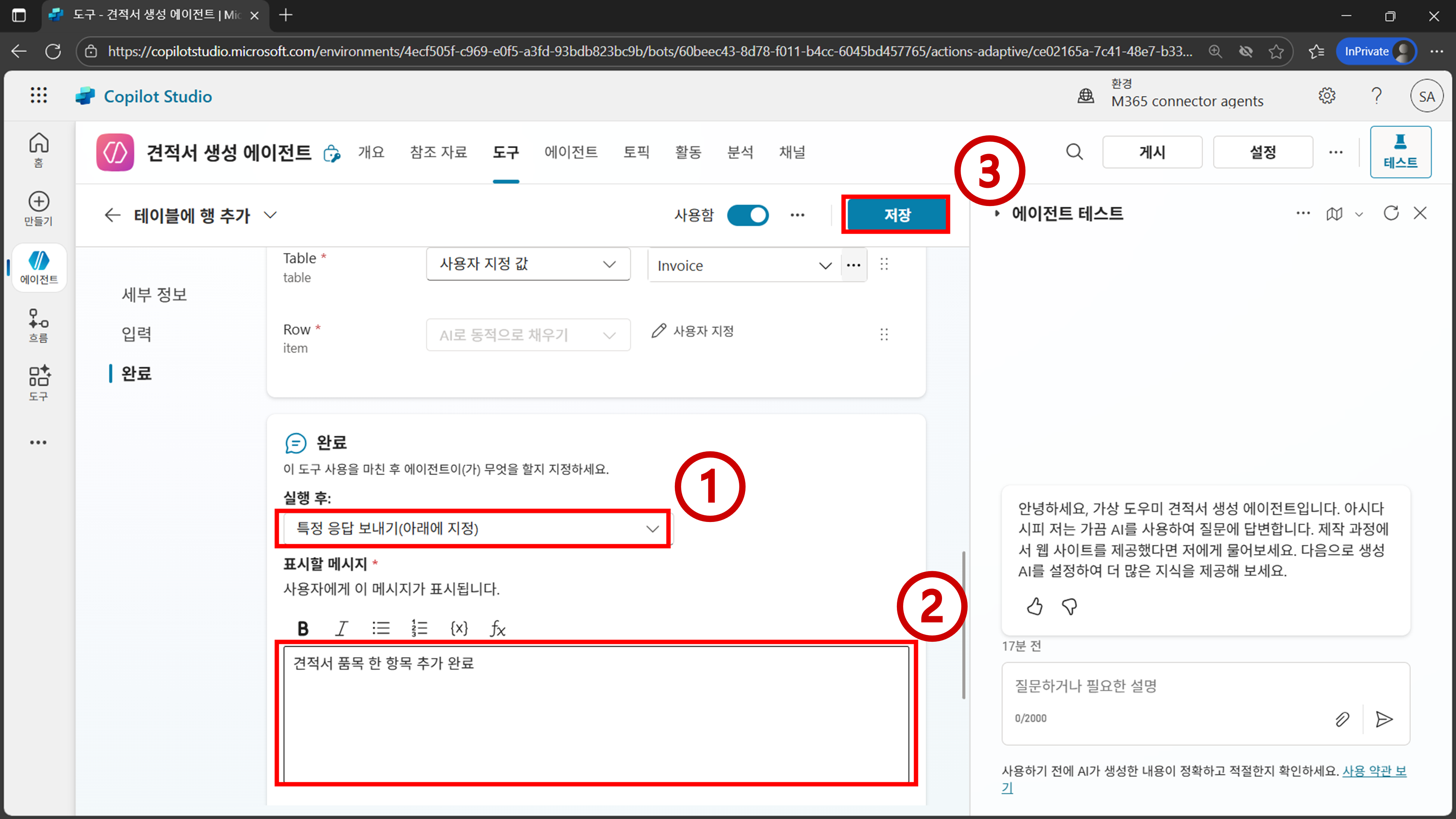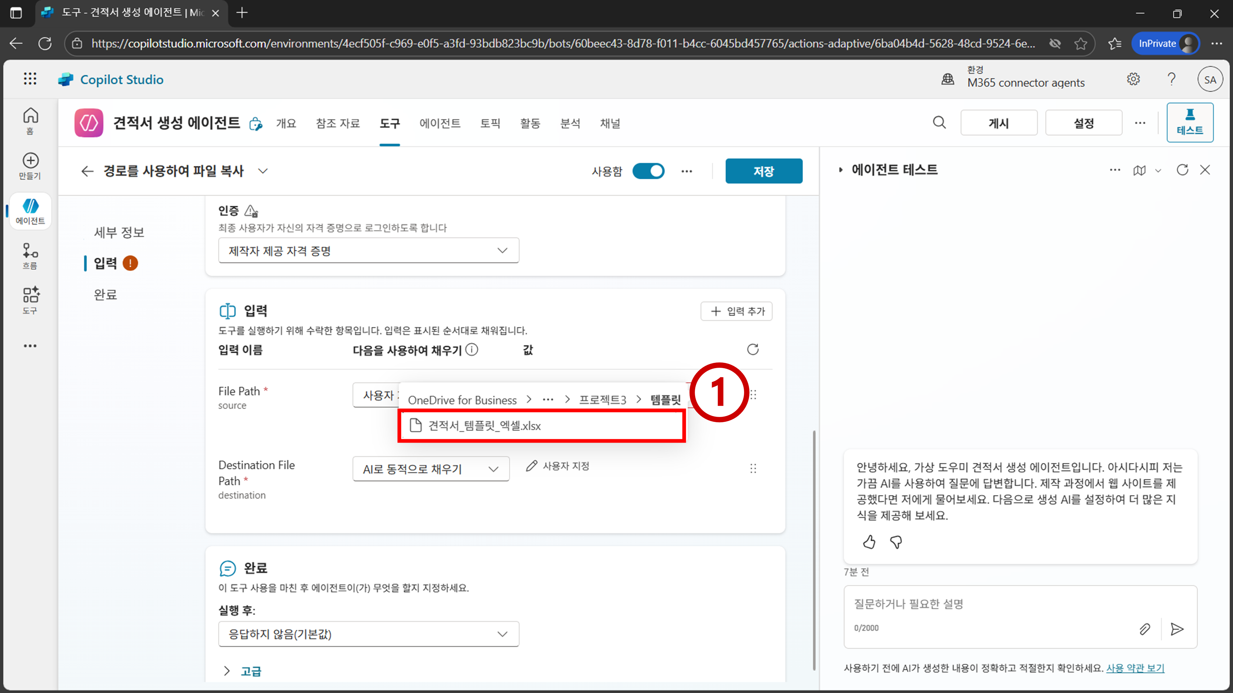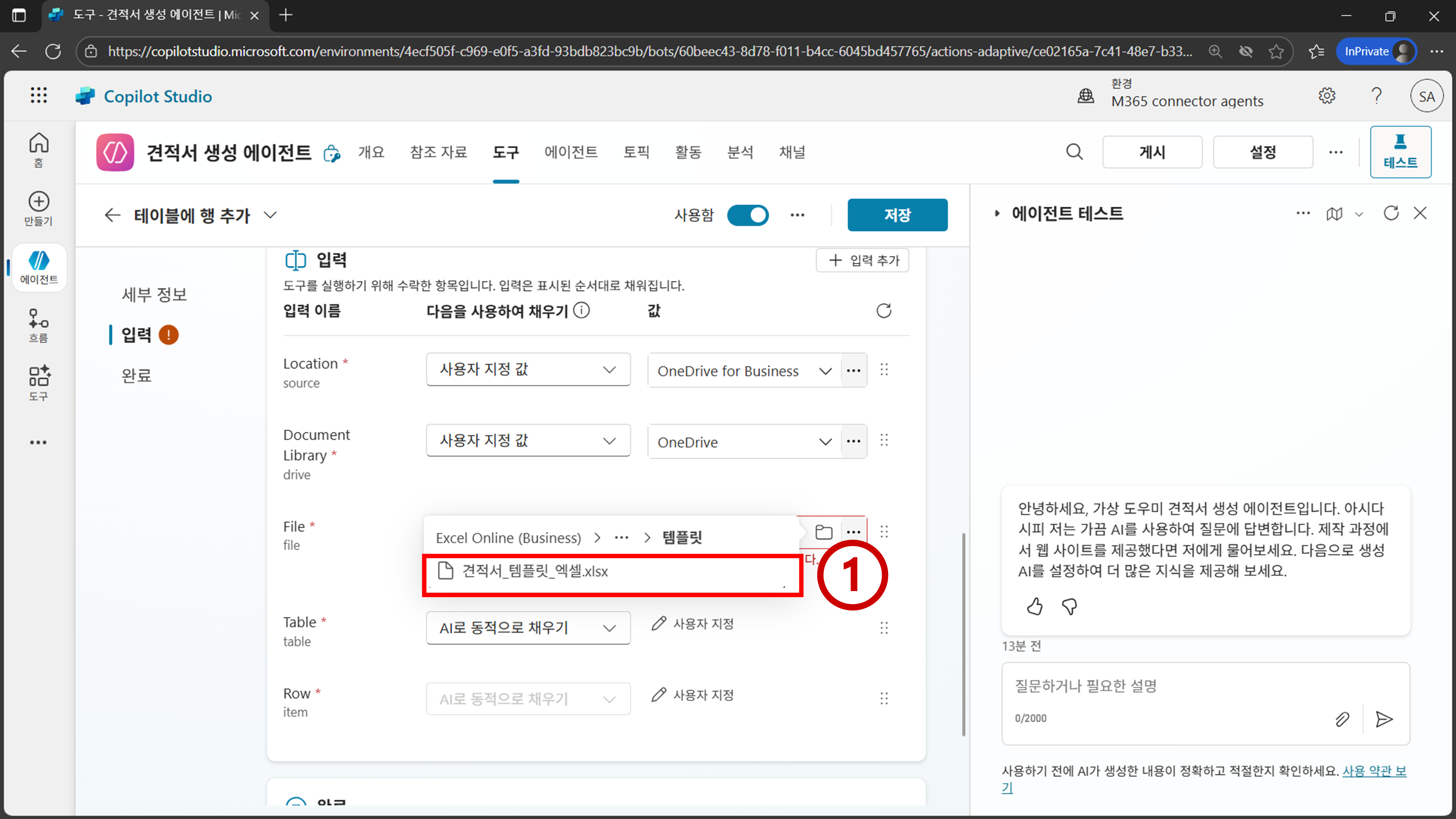 완료 > 실행 후를특정 응답 보내기(아래에 지정)으로 설정한다.표시할 메시지에이메일 불러오기 완료를 입력한다. 그리고저장을 클릭한다.도구 > 도구 추가를 클릭한다.비지니스용 OneDrive를 클릭한다.경로를 사용하여 파일 복사를 클릭한다.연결에 앞서 실습 환경 설정 단계에서 구축해둔 본인의 이메일로된 연결이 자동 선택된 것을 확인한다.추가 및 구성을 클릭한다.추가 세부 정보 > 인증값을제작자 제공 자격 증명으로 설정한다.File Path를사용자 지정 값으로 설정하고폴더아이콘을 클릭한다.Root > 코파일럿 에이전트 교육 개인 폴더 > 프로젝트3 > 템플릿 > 견적서_템플릿_엑셀.xlsx파일을 선택한다.Destination File Path를사용자 지정 값으로 설정한 뒤값에는/코파일럿 에이전트 교육 개인 폴더/프로젝트3/견적서/견적서.xlsx를 입력한다.완료 > 실행 후를특정 응답 보내기(아래에 지정)으로 설정한다.표시할 메시지에견적서 복사 완료를 입력한다. 그리고저장을 클릭한다.도구 > 도구 추가를 클릭한다.Excel Online(Business)를 클릭한다.테이블에 행 추가를 클릭한다.연결에 앞서 실습 환경 설정 단계에서 구축해둔 본인의 이메일로된 연결이 자동 선택된 것을 확인한다.추가 및 구성을 클릭한다.추가 세부 정보 > 인증값을제작자 제공 자격 증명으로 설정한다.Location을사용자 지정 값으로 설정한다.값을OneDrive for Business로 설정한다.Document Library를사용자 지정 값,OneDrive(또는문서로 이름이 되어 있을 수 있음)로 설정한다.File을사용자 지정 값으로 설정한 뒤폴더아이콘을 클릭한다.코파일럿 에이전트 교육 개인 폴더 > 프로젝트3 > 템플릿 > 견적서_템플릿_엑셀.xlsx을 선택한다.Table을