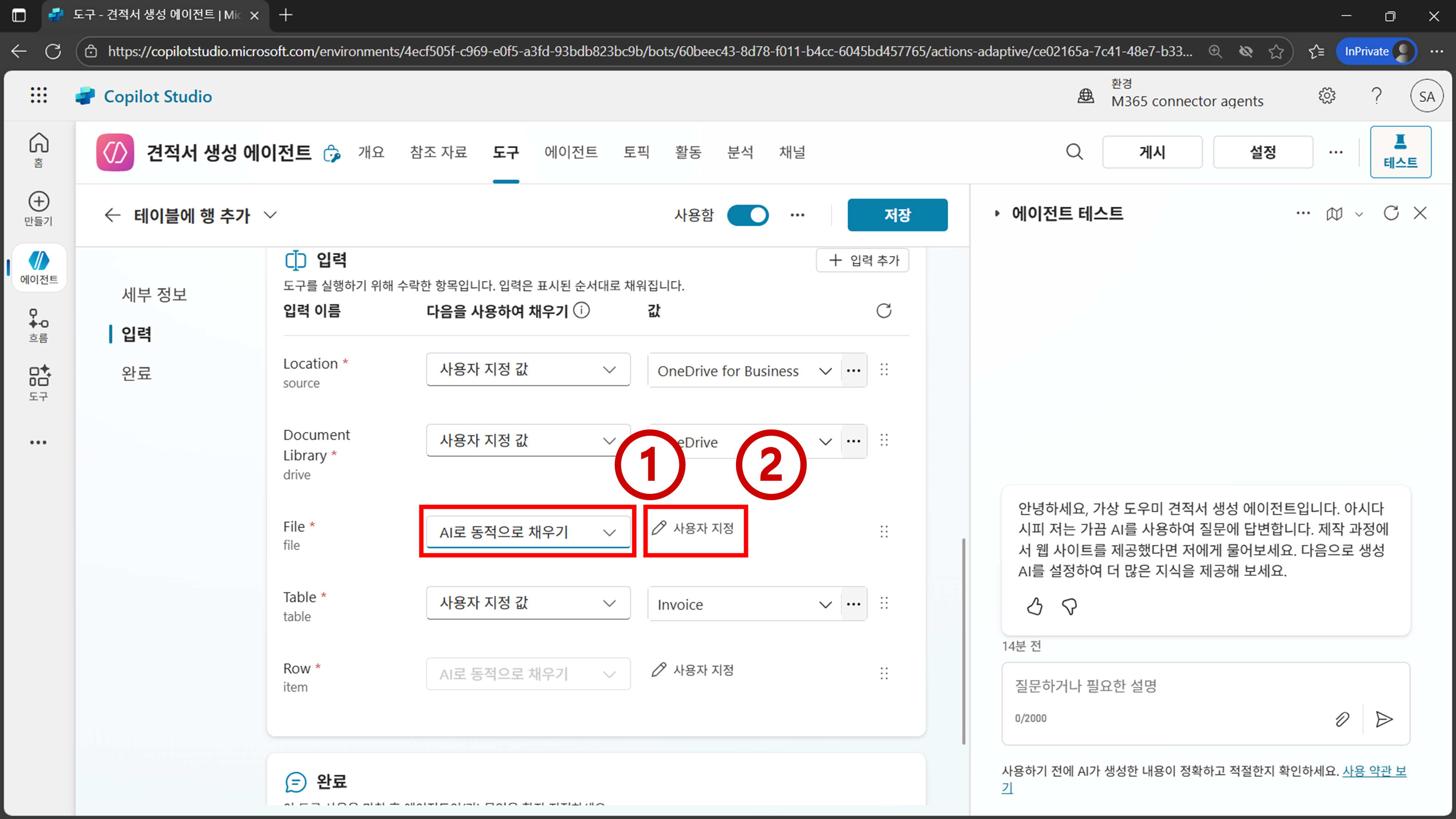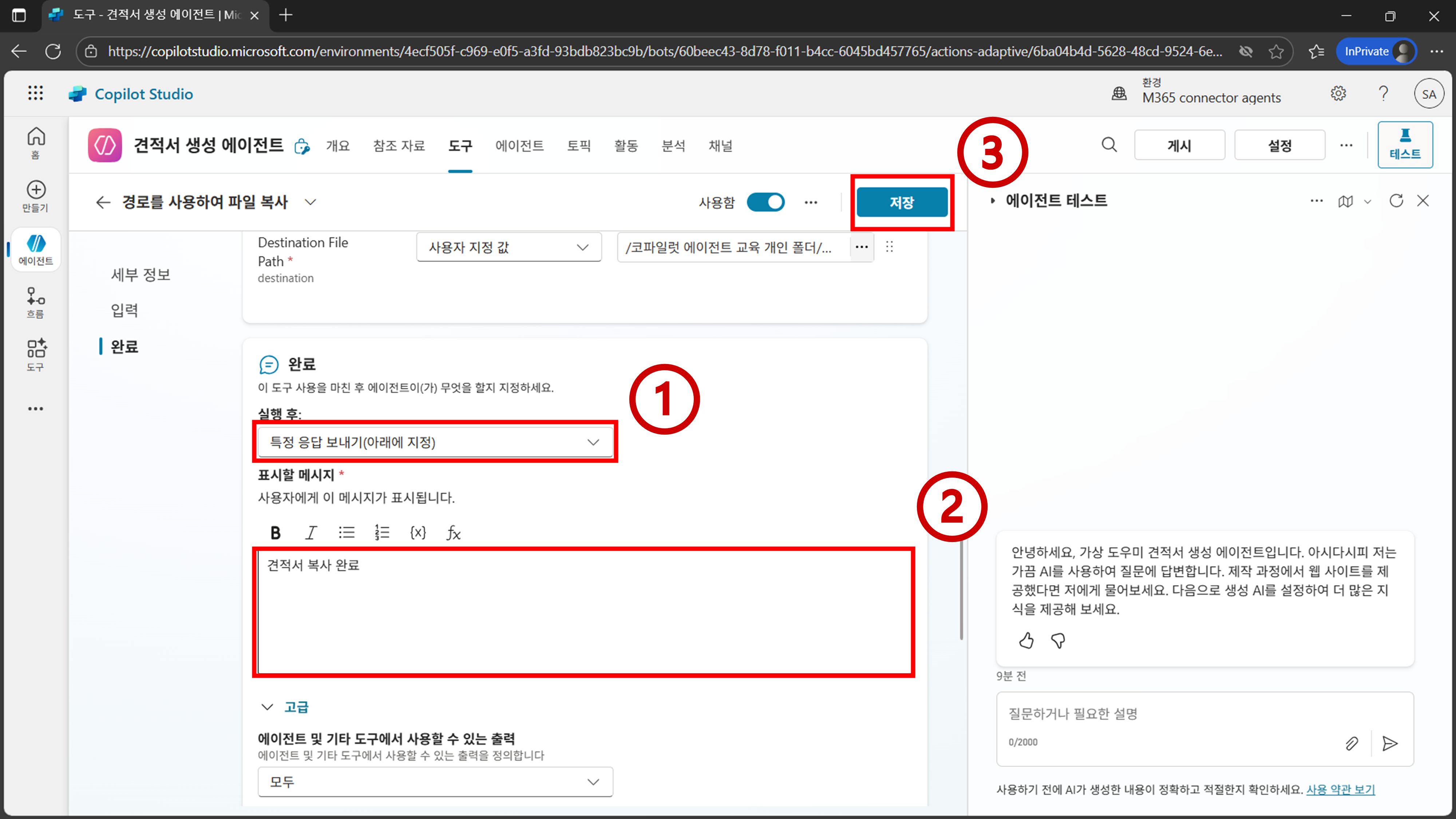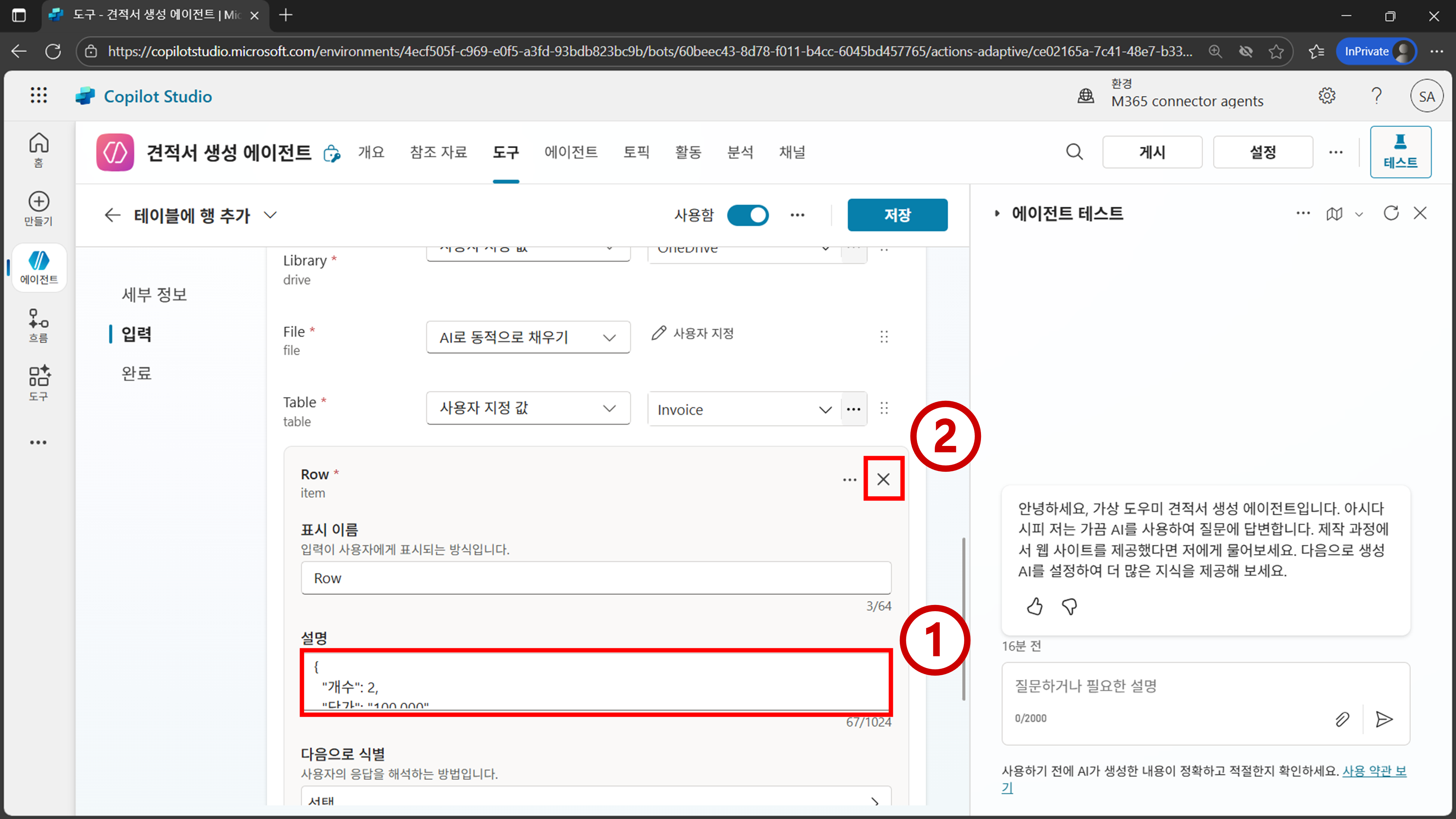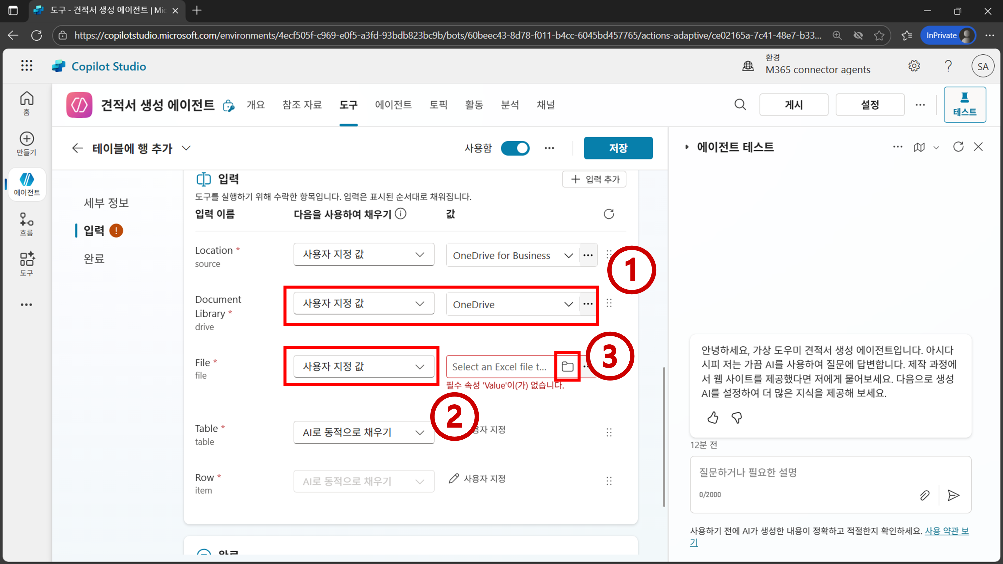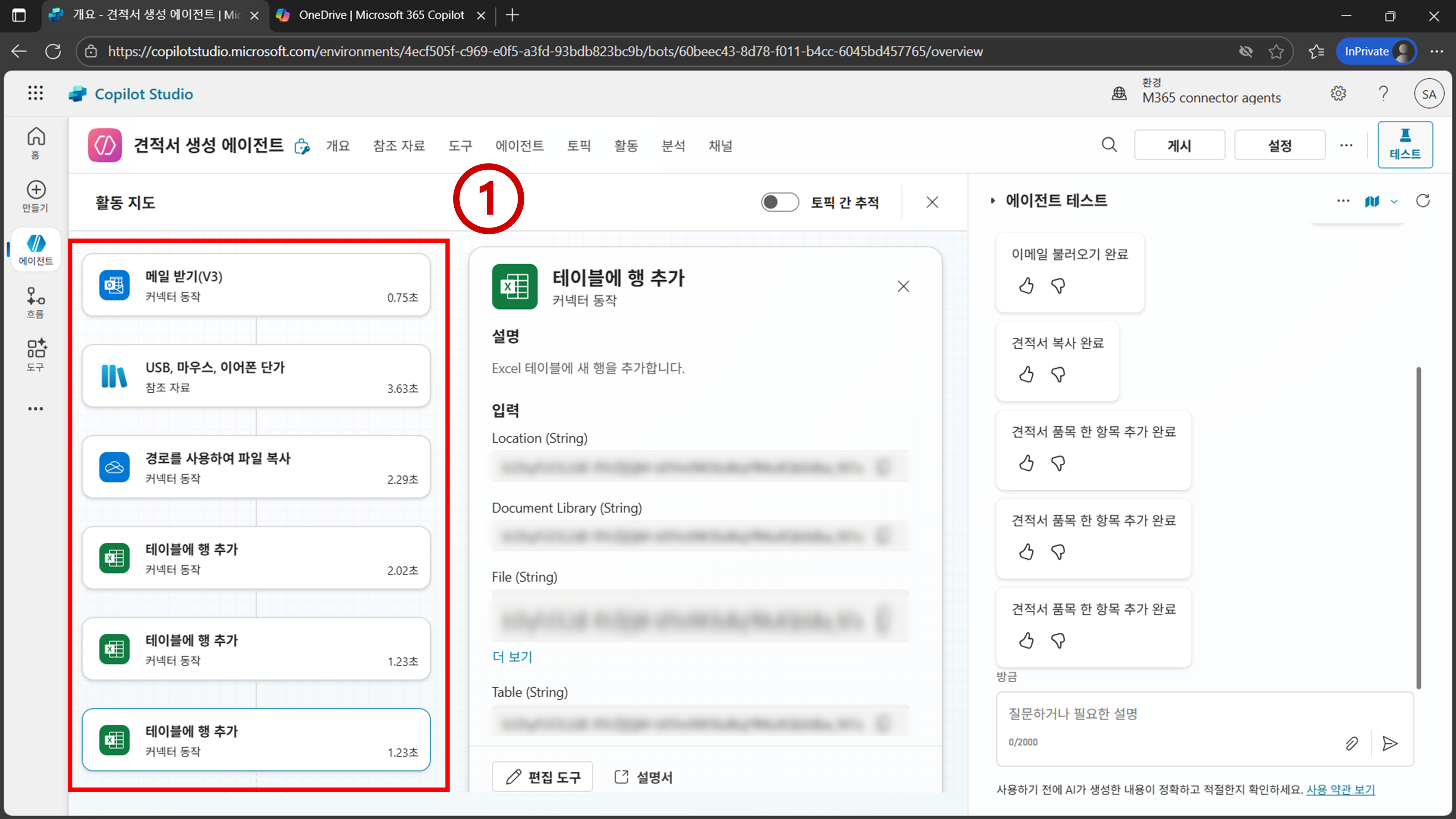 완료 > 실행 후를특정 응답 보내기(아래에 지정)으로 설정한다.표시할 메시지에이메일 불러오기 완료를 입력한다. 그리고저장을 클릭한다.도구 > 도구 추가를 클릭한다.비지니스용 OneDrive를 클릭한다.경로를 사용하여 파일 복사를 클릭한다.연결에 앞서 실습 환경 설정 단계에서 구축해둔 본인의 이메일로된 연결이 자동 선택된 것을 확인한다.추가 및 구성을 클릭한다.추가 세부 정보 > 인증값을제작자 제공 자격 증명으로 설정한다.File Path를사용자 지정 값으로 설정하고폴더아이콘을 클릭한다.Root > 코파일럿 에이전트 교육 개인 폴더 > 프로젝트3 > 템플릿 > 견적서_템플릿_엑셀.xlsx파일을 선택한다.Destination File Path를사용자 지정 값으로 설정한 뒤값에는/코파일럿 에이전트 교육 개인 폴더/프로젝트3/견적서/견적서.xlsx를 입력한다.완료 > 실행 후를특정 응답 보내기(아래에 지정)으로 설정한다.표시할 메시지에견적서 복사 완료를 입력한다. 그리고저장을 클릭한다.도구 > 도구 추가를 클릭한다.Excel Online(Business)를 클릭한다.테이블에 행 추가를 클릭한다.연결에 앞서 실습 환경 설정 단계에서 구축해둔 본인의 이메일로된 연결이 자동 선택된 것을 확인한다.추가 및 구성을 클릭한다.추가 세부 정보 > 인증값을제작자 제공 자격 증명으로 설정한다.Location을사용자 지정 값으로 설정한다.값을OneDrive for Business로 설정한다.Document Library를사용자 지정 값,OneDrive(또는문서로 이름이 되어 있을 수 있음)로 설정한다.File을사용자 지정 값으로 설정한 뒤폴더아이콘을 클릭한다.코파일럿 에이전트 교육 개인 폴더 > 프로젝트3 > 템플릿 > 견적서_템플릿_엑셀.xlsx을 선택한다.Table을