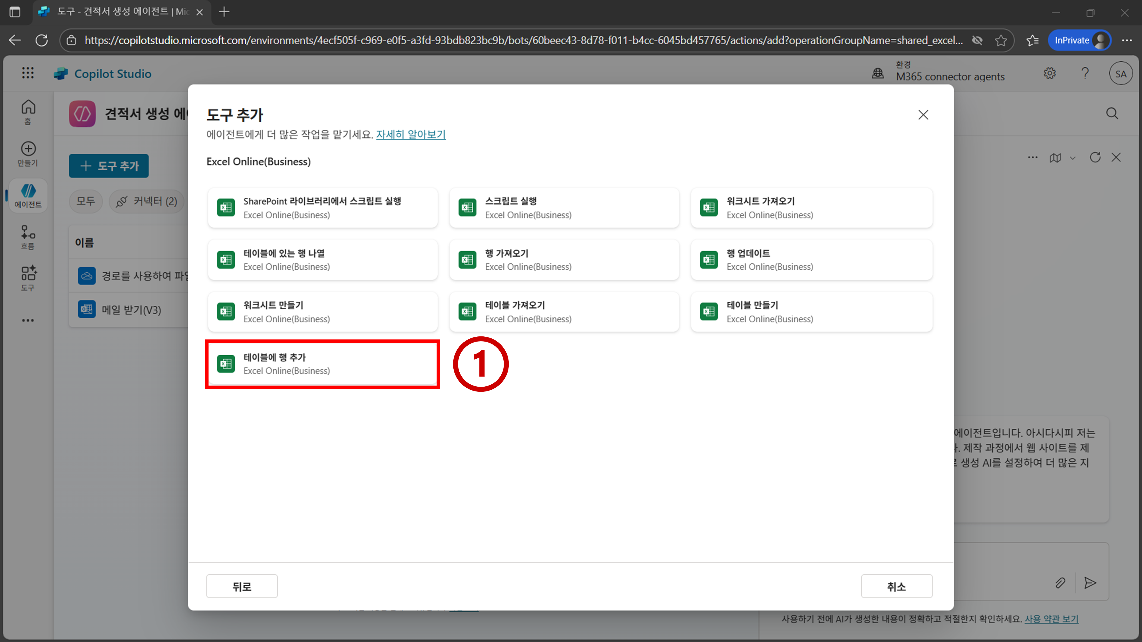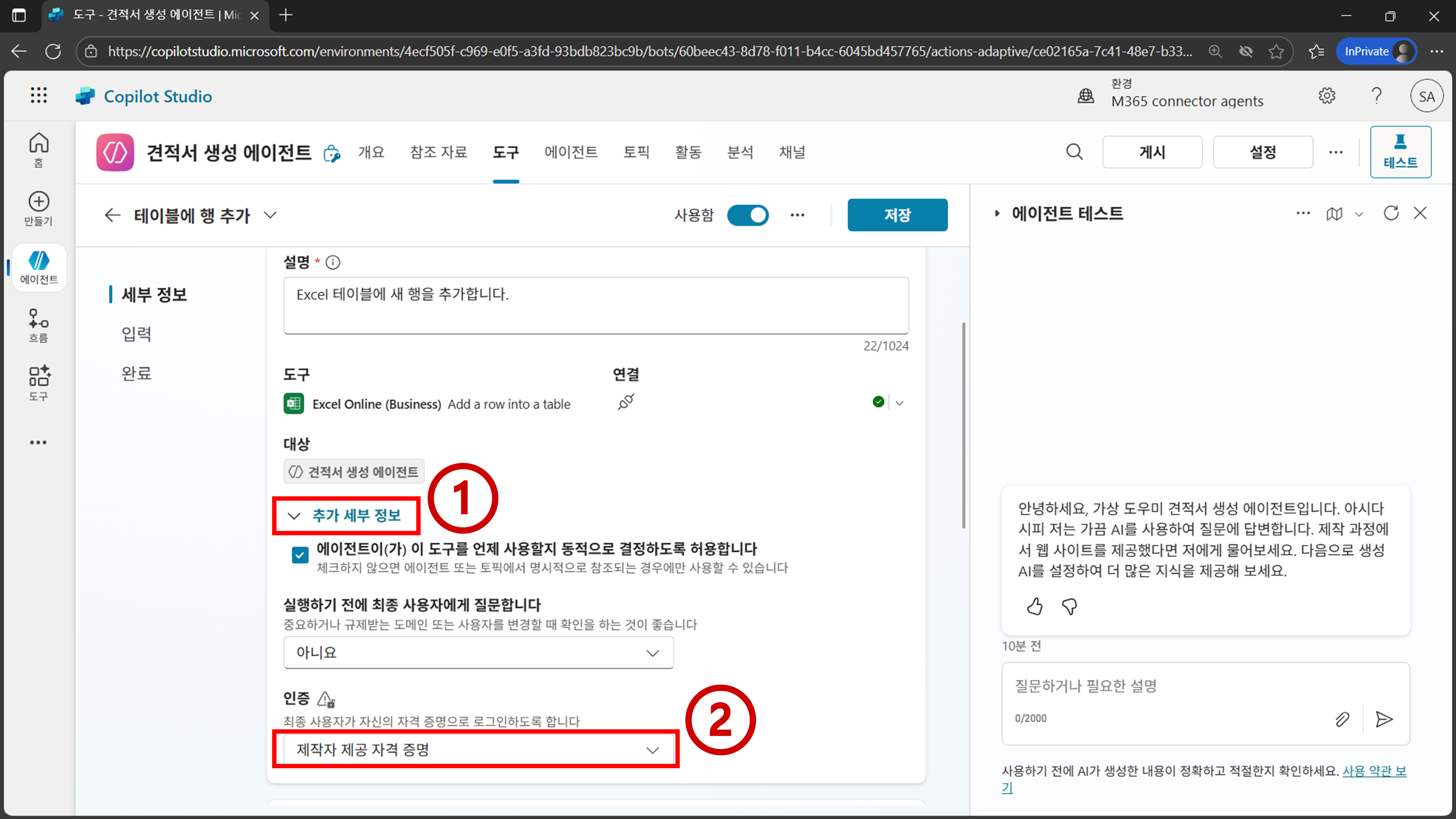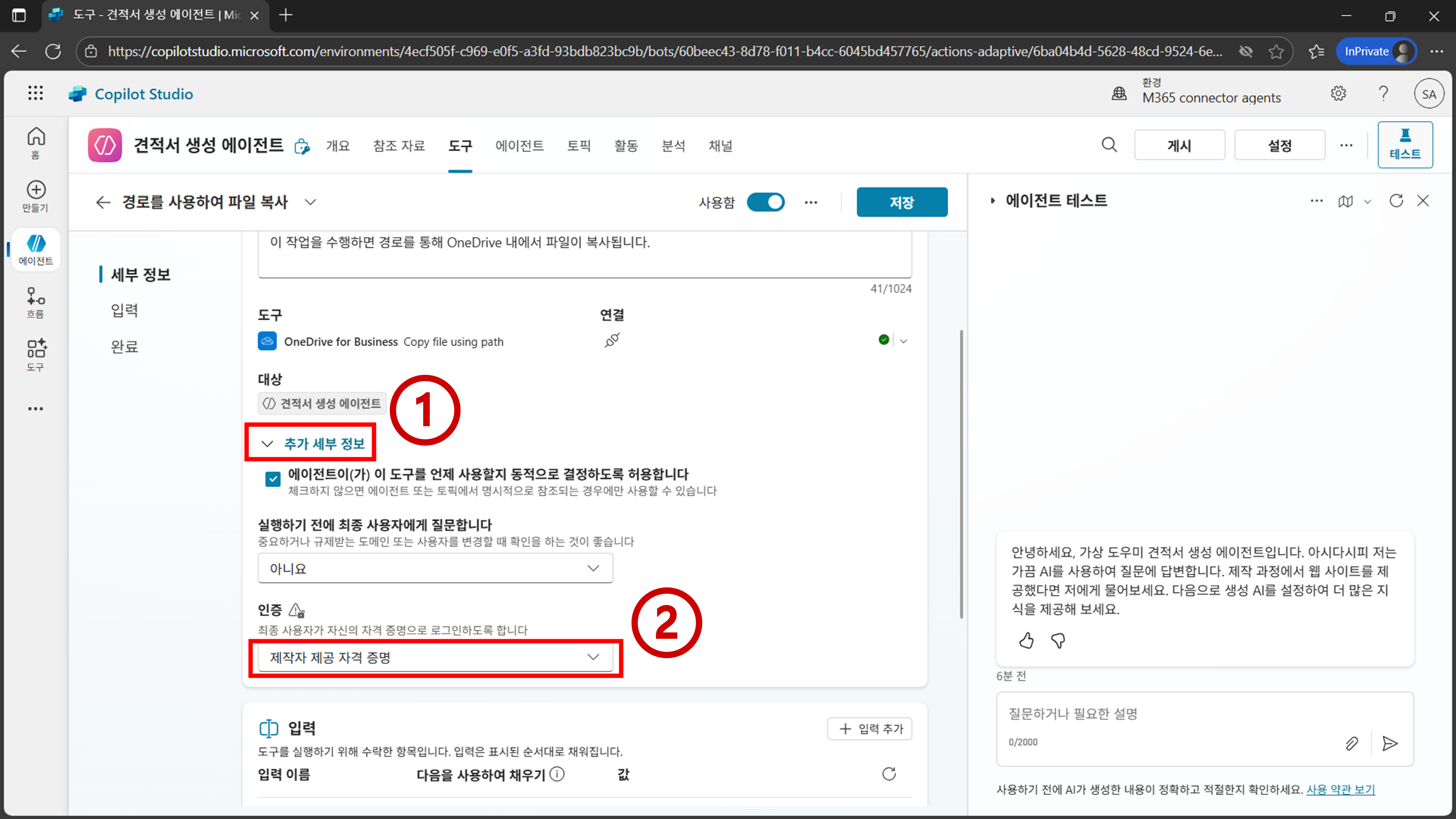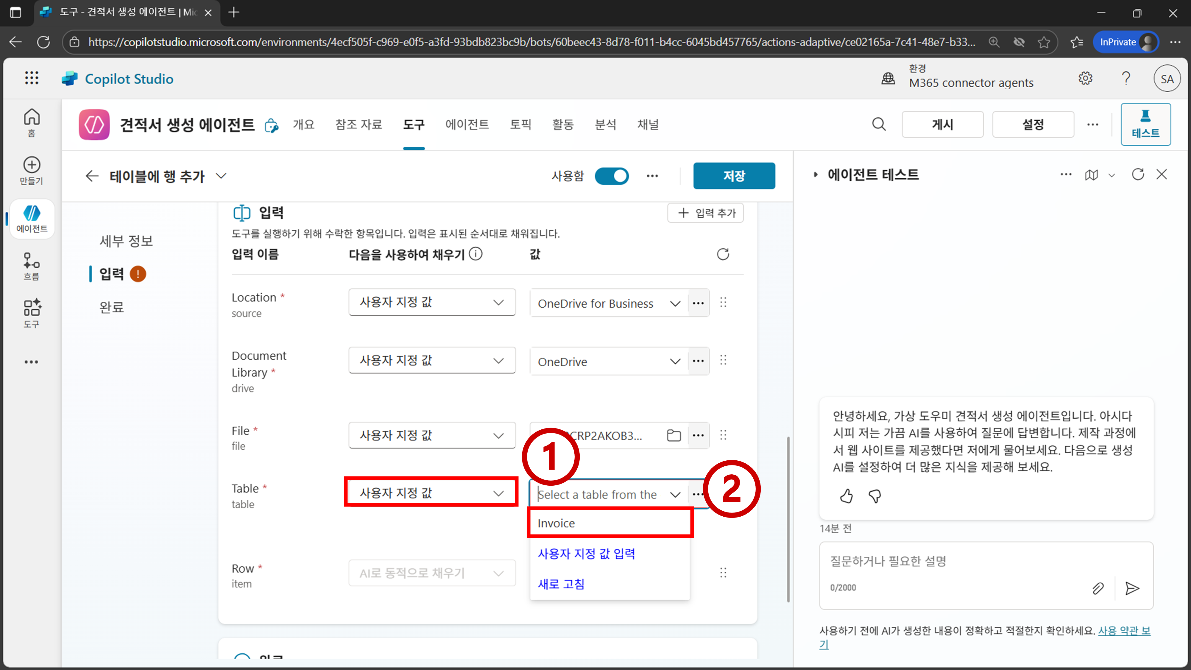 완료 > 실행 후를특정 응답 보내기(아래에 지정)으로 설정한다.표시할 메시지에이메일 불러오기 완료를 입력한다. 그리고저장을 클릭한다.도구 > 도구 추가를 클릭한다.비지니스용 OneDrive를 클릭한다.경로를 사용하여 파일 복사를 클릭한다.연결에 앞서 실습 환경 설정 단계에서 구축해둔 본인의 이메일로된 연결이 자동 선택된 것을 확인한다.추가 및 구성을 클릭한다.추가 세부 정보 > 인증값을제작자 제공 자격 증명으로 설정한다.File Path를사용자 지정 값으로 설정하고폴더아이콘을 클릭한다.Root > 코파일럿 에이전트 교육 개인 폴더 > 프로젝트3 > 템플릿 > 견적서_템플릿_엑셀.xlsx파일을 선택한다.Destination File Path를사용자 지정 값으로 설정한 뒤값에는/코파일럿 에이전트 교육 개인 폴더/프로젝트3/견적서/견적서.xlsx를 입력한다.완료 > 실행 후를특정 응답 보내기(아래에 지정)으로 설정한다.표시할 메시지에견적서 복사 완료를 입력한다. 그리고저장을 클릭한다.도구 > 도구 추가를 클릭한다.Excel Online(Business)를 클릭한다.테이블에 행 추가를 클릭한다.연결에 앞서 실습 환경 설정 단계에서 구축해둔 본인의 이메일로된 연결이 자동 선택된 것을 확인한다.추가 및 구성을 클릭한다.추가 세부 정보 > 인증값을제작자 제공 자격 증명으로 설정한다.Location을사용자 지정 값으로 설정한다.값을OneDrive for Business로 설정한다.Document Library를사용자 지정 값,OneDrive(또는문서로 이름이 되어 있을 수 있음)로 설정한다.File을사용자 지정 값으로 설정한 뒤폴더아이콘을 클릭한다.코파일럿 에이전트 교육 개인 폴더 > 프로젝트3 > 템플릿 > 견적서_템플릿_엑셀.xlsx을 선택한다.Table을
