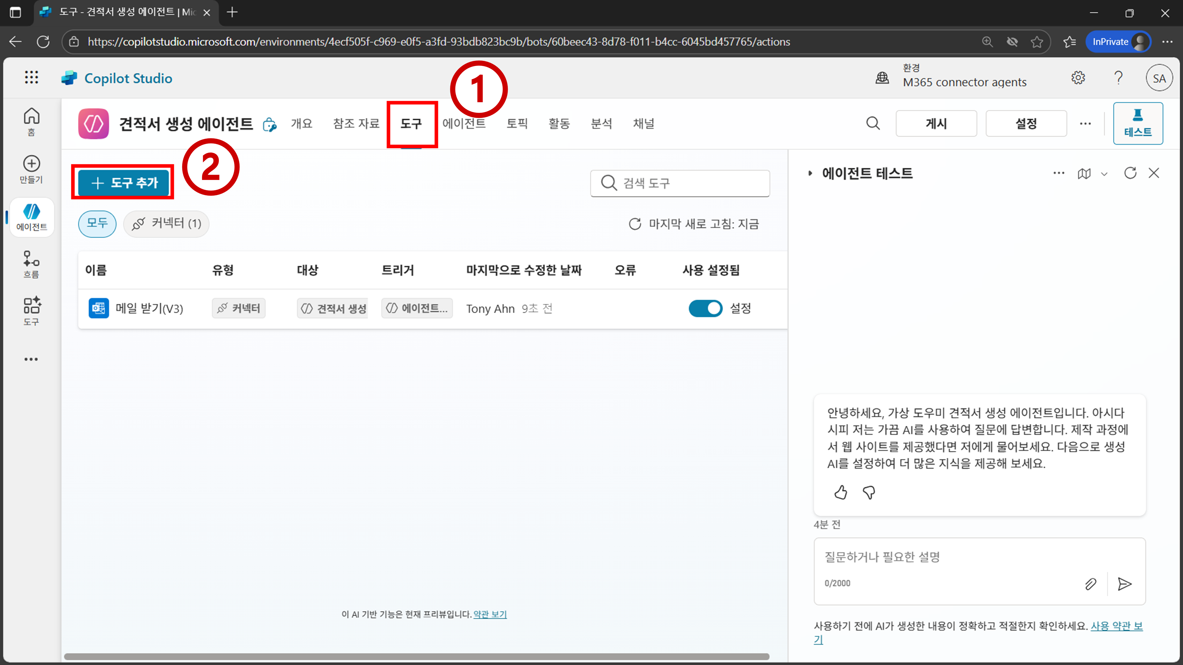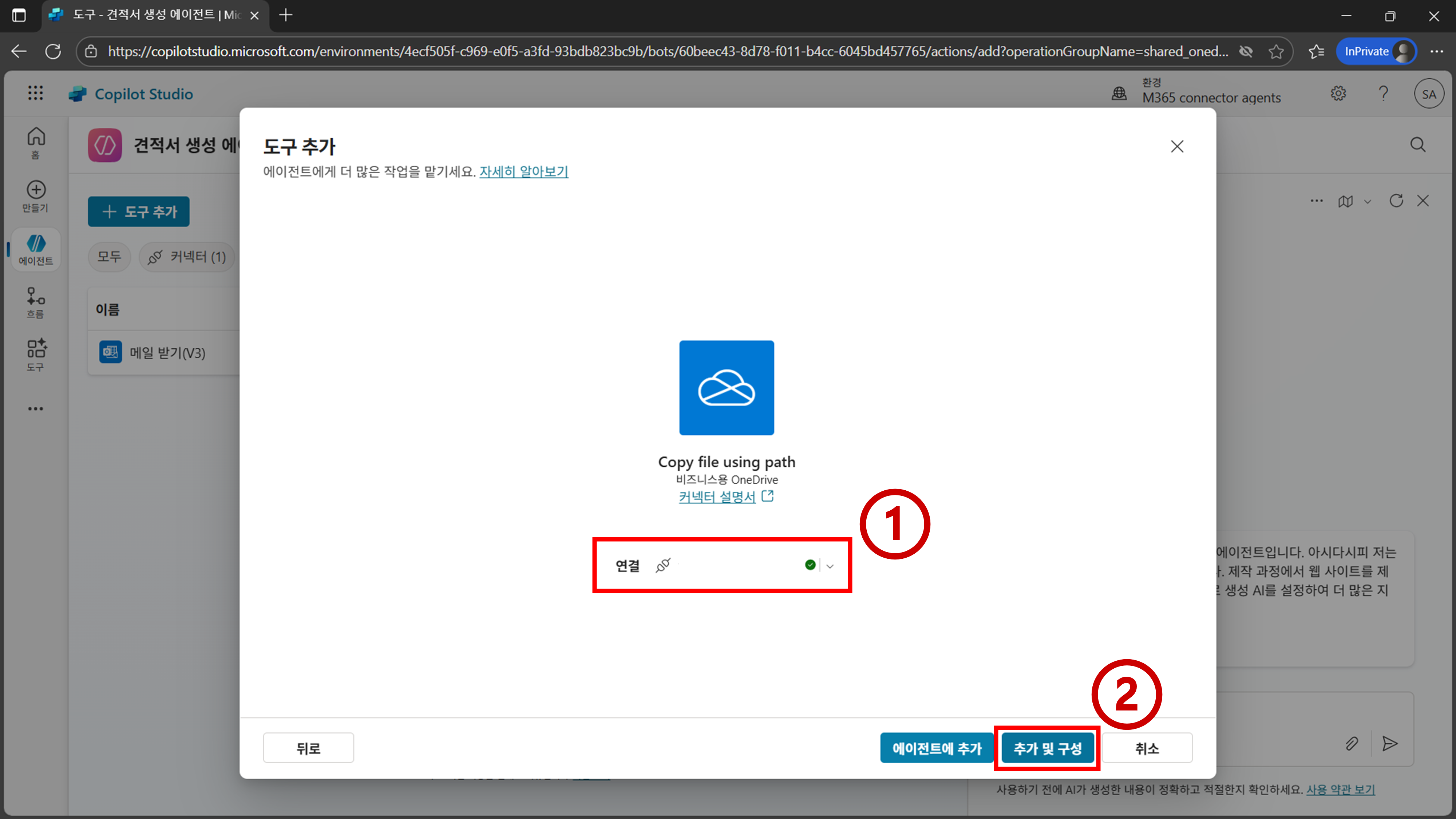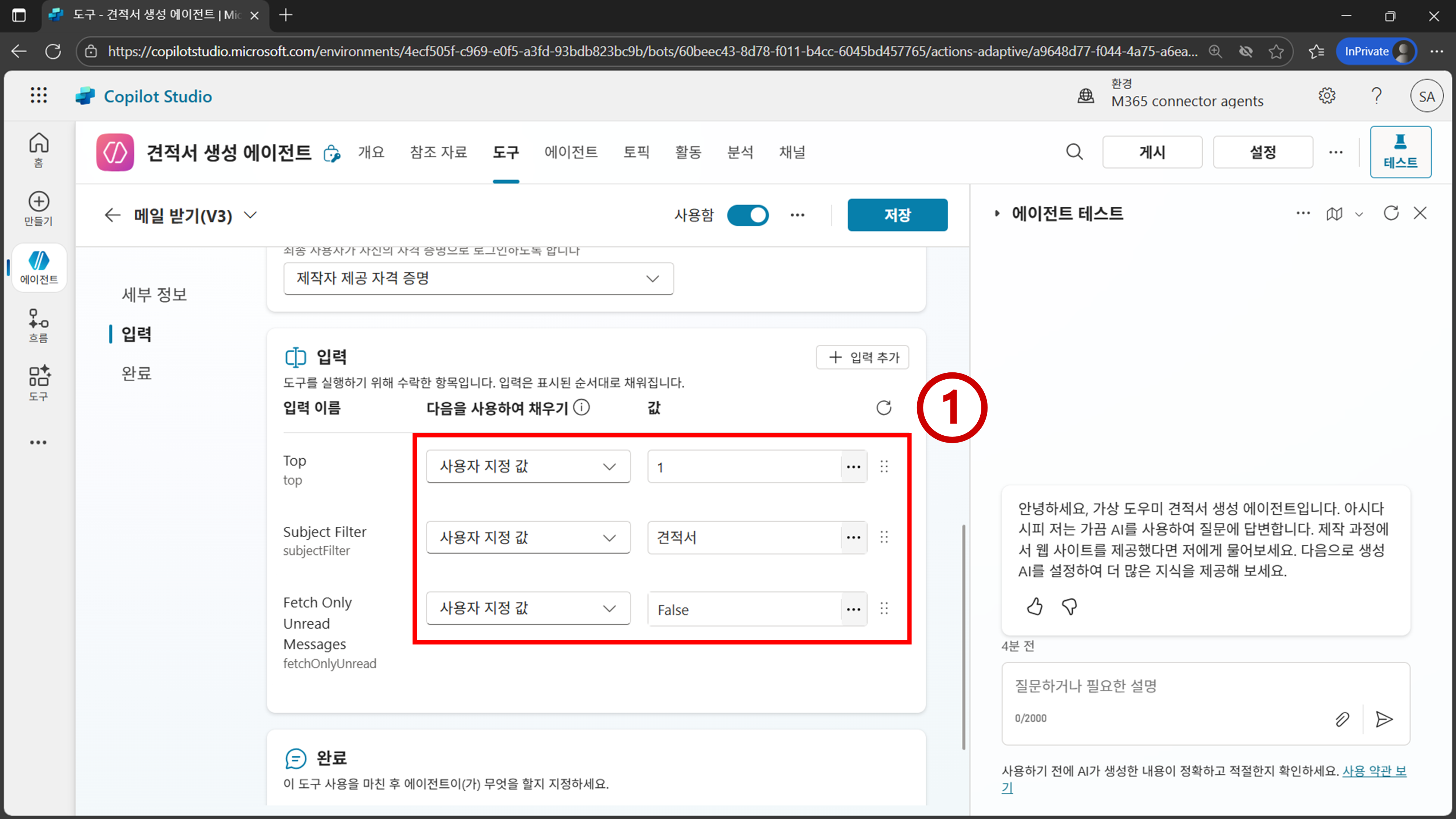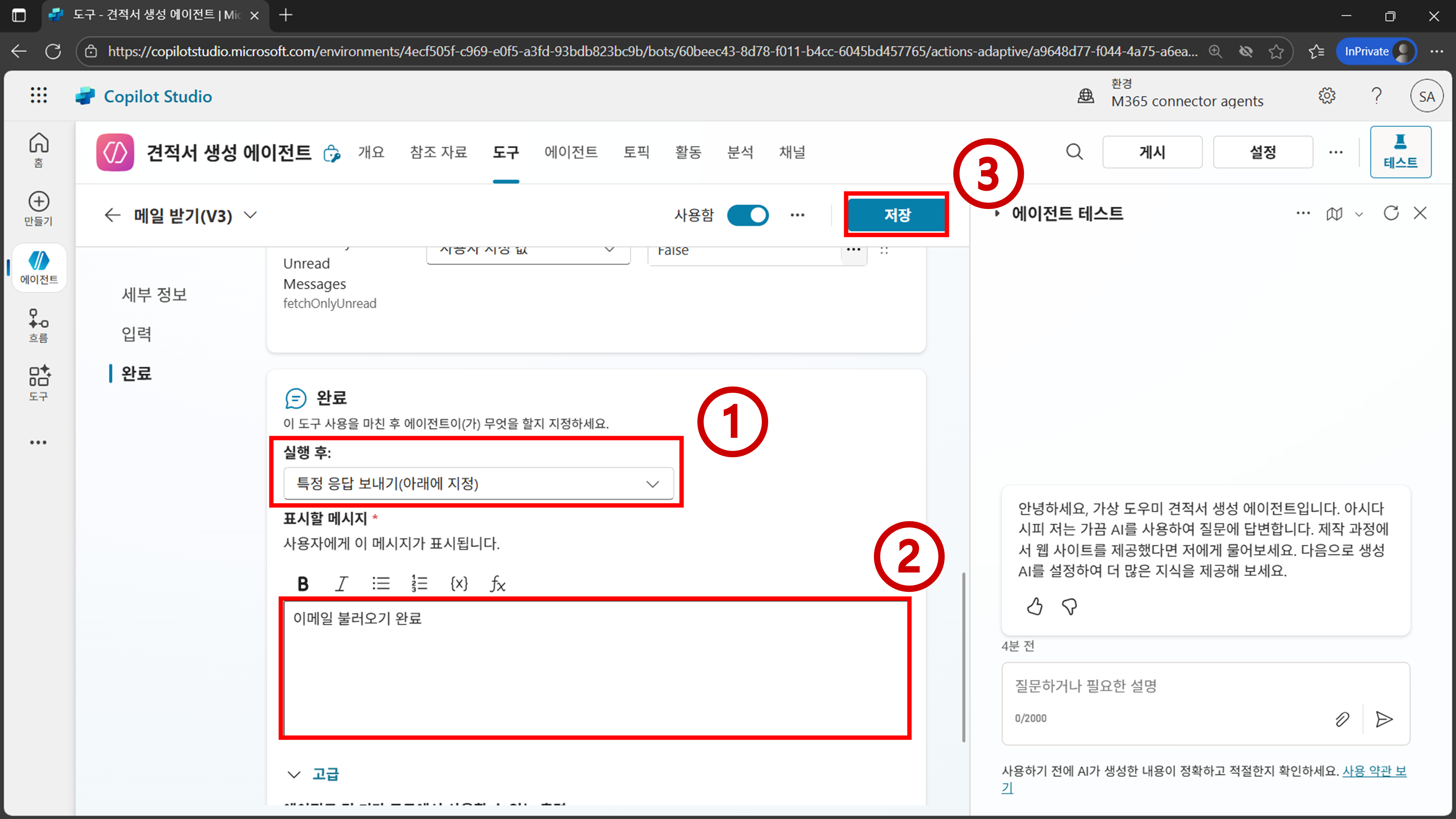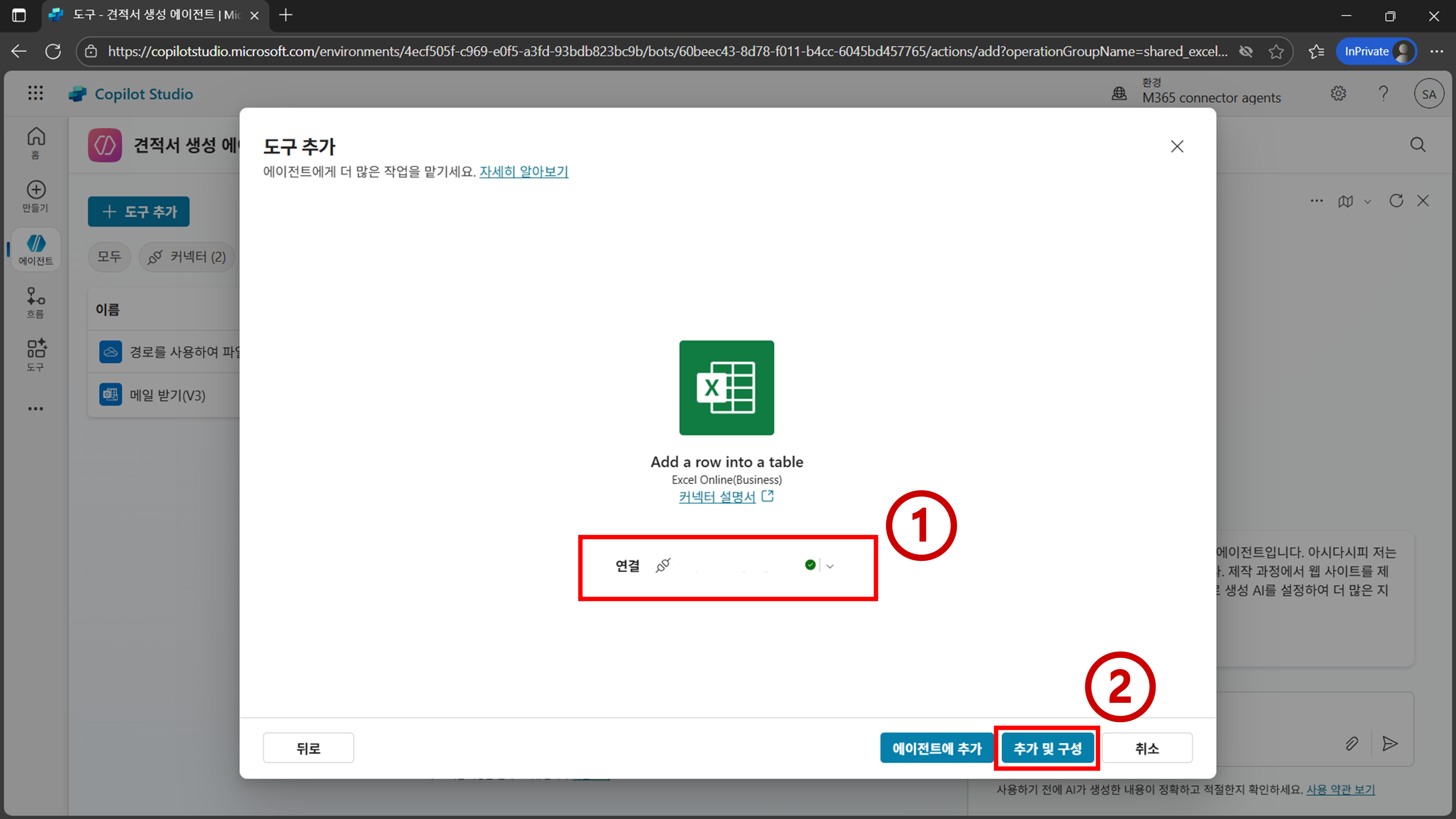 완료 > 실행 후를특정 응답 보내기(아래에 지정)으로 설정한다.표시할 메시지에이메일 불러오기 완료를 입력한다. 그리고저장을 클릭한다.도구 > 도구 추가를 클릭한다.비지니스용 OneDrive를 클릭한다.경로를 사용하여 파일 복사를 클릭한다.연결에 앞서 실습 환경 설정 단계에서 구축해둔 본인의 이메일로된 연결이 자동 선택된 것을 확인한다.추가 및 구성을 클릭한다.추가 세부 정보 > 인증값을제작자 제공 자격 증명으로 설정한다.File Path를사용자 지정 값으로 설정하고폴더아이콘을 클릭한다.Root > 코파일럿 에이전트 교육 개인 폴더 > 프로젝트3 > 템플릿 > 견적서_템플릿_엑셀.xlsx파일을 선택한다.Destination File Path를사용자 지정 값으로 설정한 뒤값에는/코파일럿 에이전트 교육 개인 폴더/프로젝트3/견적서/견적서.xlsx를 입력한다.완료 > 실행 후를특정 응답 보내기(아래에 지정)으로 설정한다.표시할 메시지에견적서 복사 완료를 입력한다. 그리고저장을 클릭한다.도구 > 도구 추가를 클릭한다.Excel Online(Business)를 클릭한다.테이블에 행 추가를 클릭한다.연결에 앞서 실습 환경 설정 단계에서 구축해둔 본인의 이메일로된 연결이 자동 선택된 것을 확인한다.추가 및 구성을 클릭한다.추가 세부 정보 > 인증값을제작자 제공 자격 증명으로 설정한다.Location을사용자 지정 값으로 설정한다.값을OneDrive for Business로 설정한다.Document Library를사용자 지정 값,OneDrive(또는문서로 이름이 되어 있을 수 있음)로 설정한다.File을사용자 지정 값으로 설정한 뒤폴더아이콘을 클릭한다.코파일럿 에이전트 교육 개인 폴더 > 프로젝트3 > 템플릿 > 견적서_템플릿_엑셀.xlsx을 선택한다.Table을