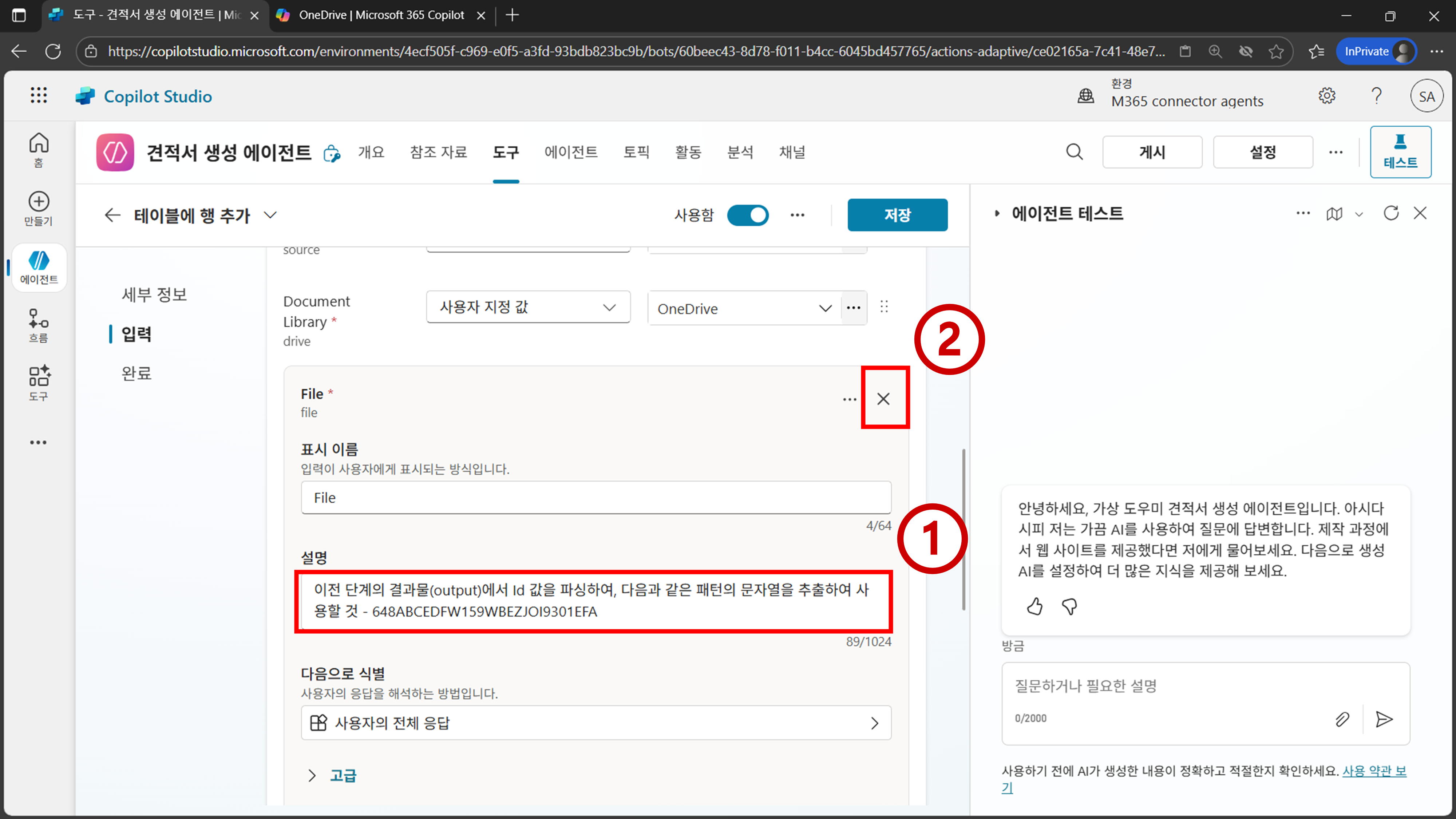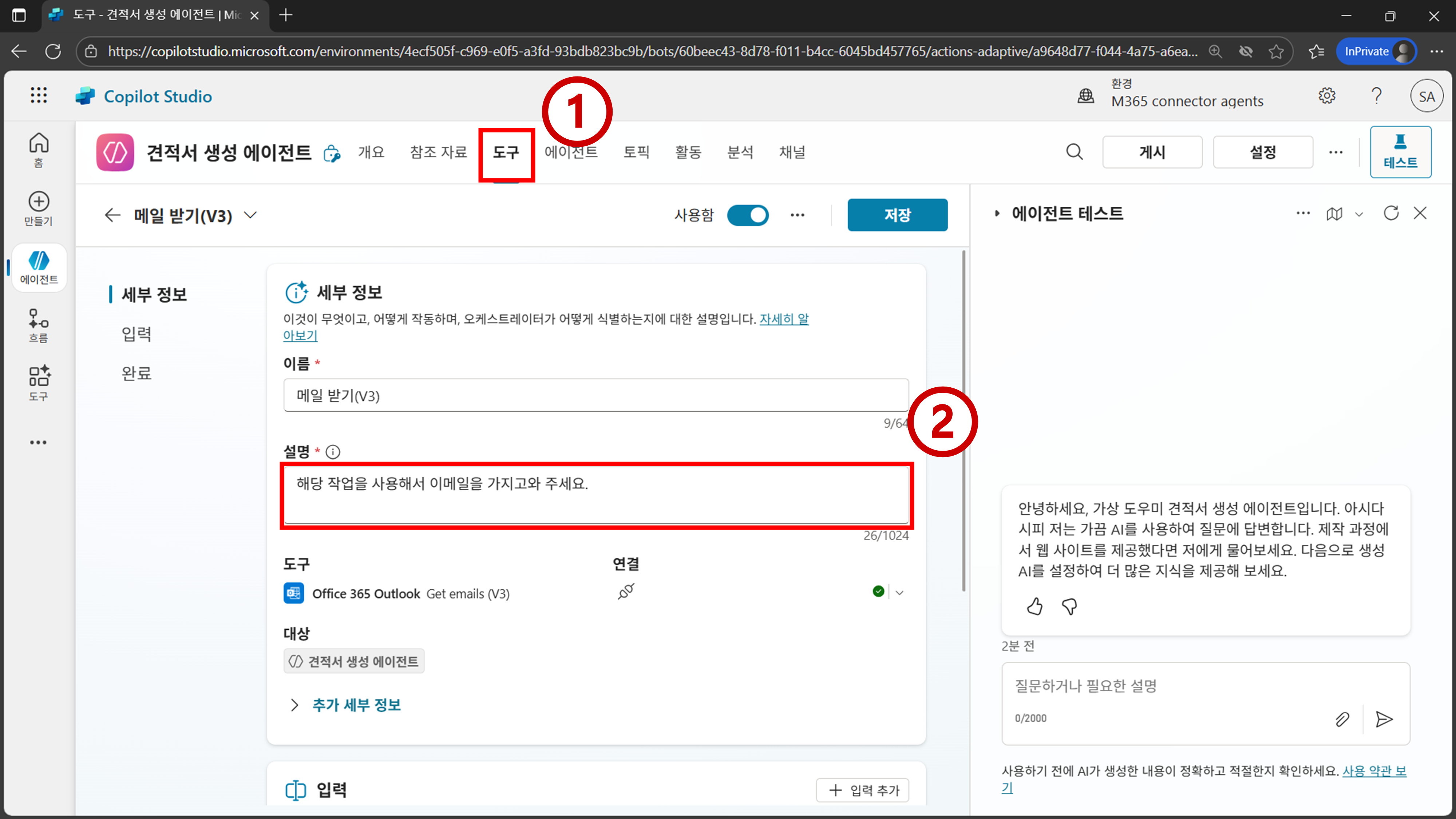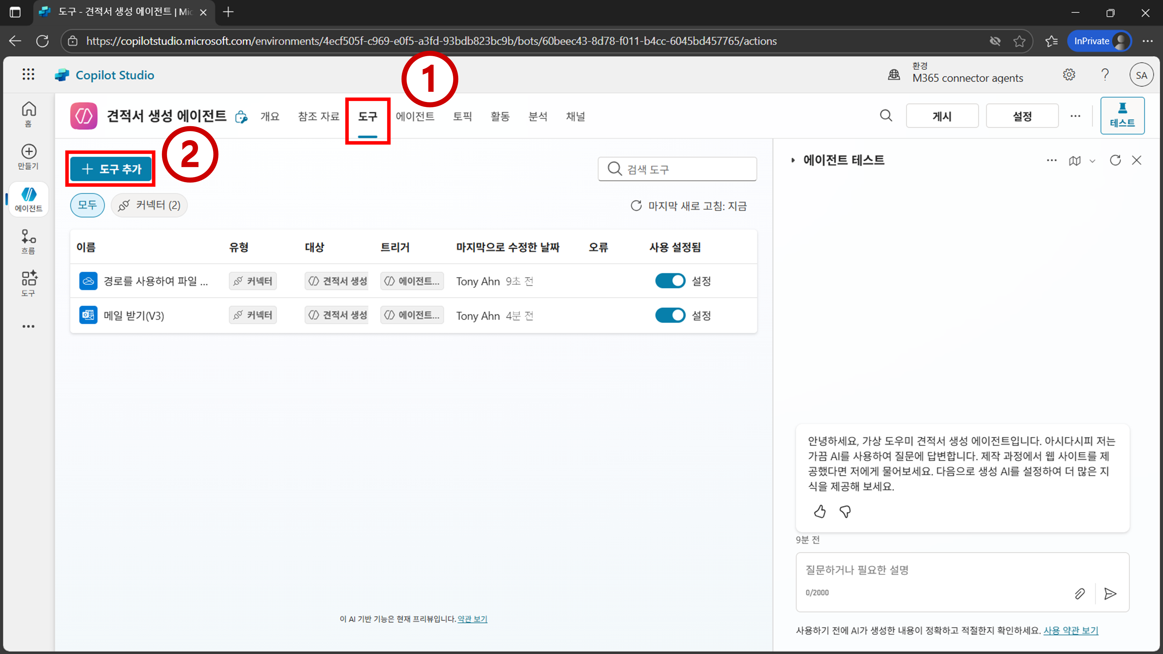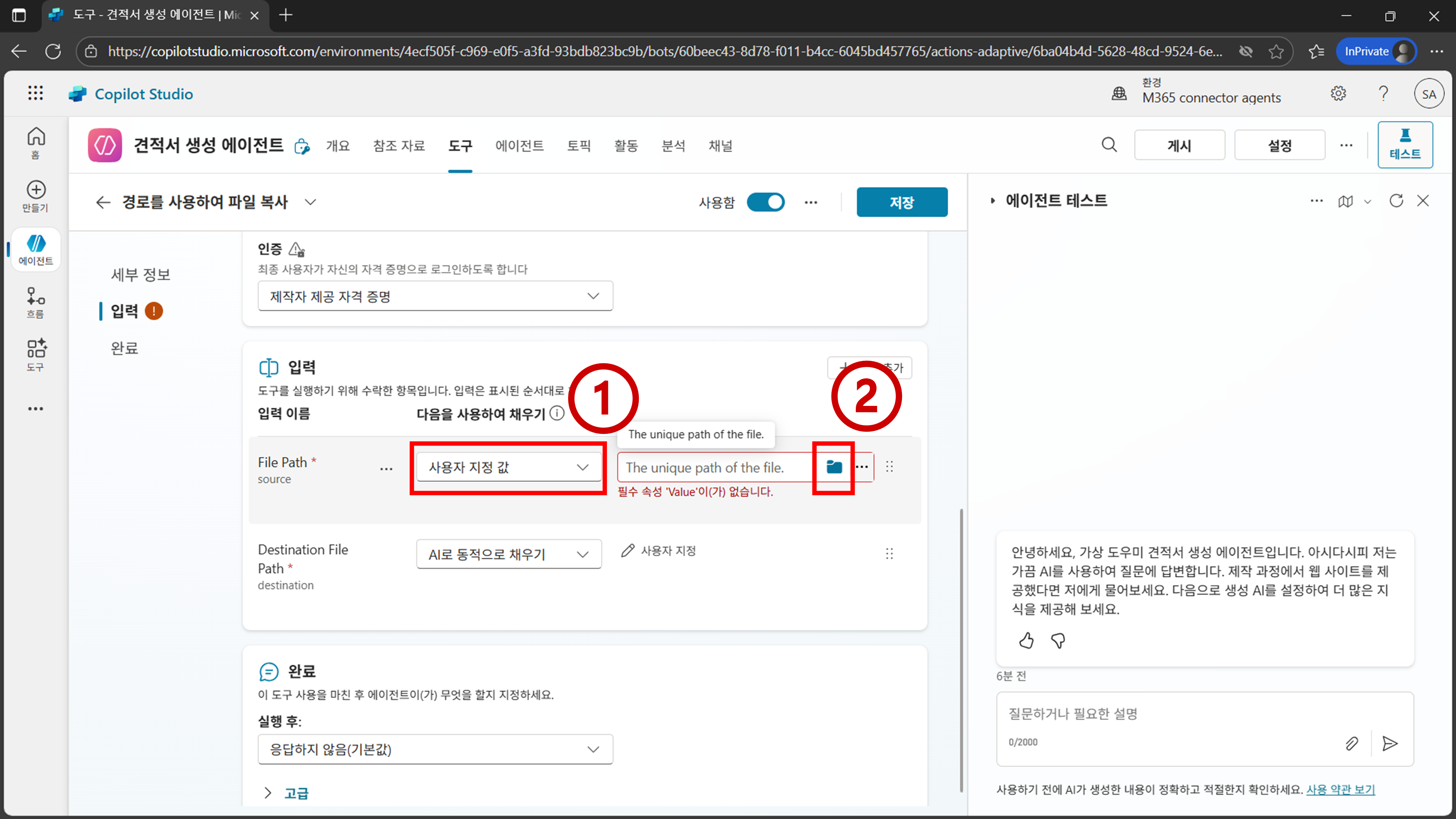 완료 > 실행 후를특정 응답 보내기(아래에 지정)으로 설정한다.표시할 메시지에이메일 불러오기 완료를 입력한다. 그리고저장을 클릭한다.도구 > 도구 추가를 클릭한다.비지니스용 OneDrive를 클릭한다.경로를 사용하여 파일 복사를 클릭한다.연결에 앞서 실습 환경 설정 단계에서 구축해둔 본인의 이메일로된 연결이 자동 선택된 것을 확인한다.추가 및 구성을 클릭한다.추가 세부 정보 > 인증값을제작자 제공 자격 증명으로 설정한다.File Path를사용자 지정 값으로 설정하고폴더아이콘을 클릭한다.Root > 코파일럿 에이전트 교육 개인 폴더 > 프로젝트3 > 템플릿 > 견적서_템플릿_엑셀.xlsx파일을 선택한다.Destination File Path를사용자 지정 값으로 설정한 뒤값에는/코파일럿 에이전트 교육 개인 폴더/프로젝트3/견적서/견적서.xlsx를 입력한다.완료 > 실행 후를특정 응답 보내기(아래에 지정)으로 설정한다.표시할 메시지에견적서 복사 완료를 입력한다. 그리고저장을 클릭한다.도구 > 도구 추가를 클릭한다.Excel Online(Business)를 클릭한다.테이블에 행 추가를 클릭한다.연결에 앞서 실습 환경 설정 단계에서 구축해둔 본인의 이메일로된 연결이 자동 선택된 것을 확인한다.추가 및 구성을 클릭한다.추가 세부 정보 > 인증값을제작자 제공 자격 증명으로 설정한다.Location을사용자 지정 값으로 설정한다.값을OneDrive for Business로 설정한다.Document Library를사용자 지정 값,OneDrive(또는문서로 이름이 되어 있을 수 있음)로 설정한다.File을사용자 지정 값으로 설정한 뒤폴더아이콘을 클릭한다.코파일럿 에이전트 교육 개인 폴더 > 프로젝트3 > 템플릿 > 견적서_템플릿_엑셀.xlsx을 선택한다.Table을