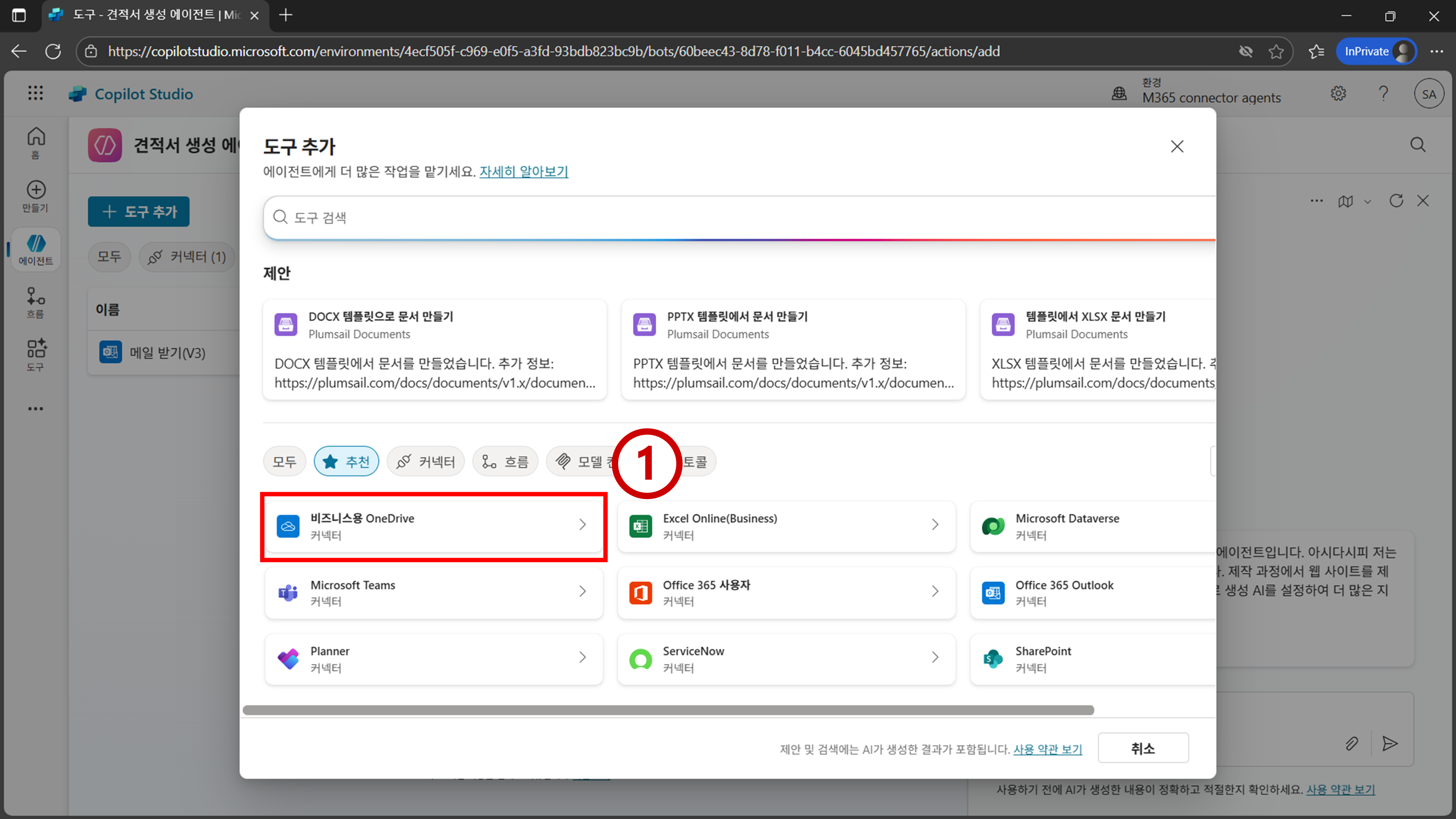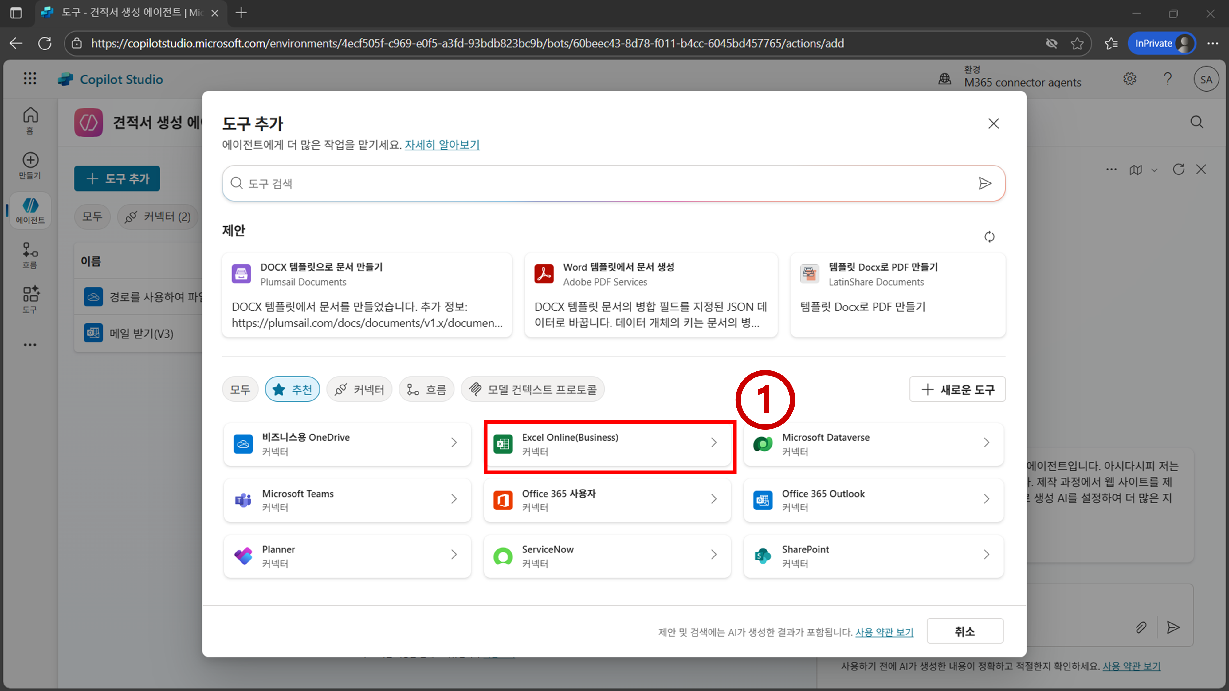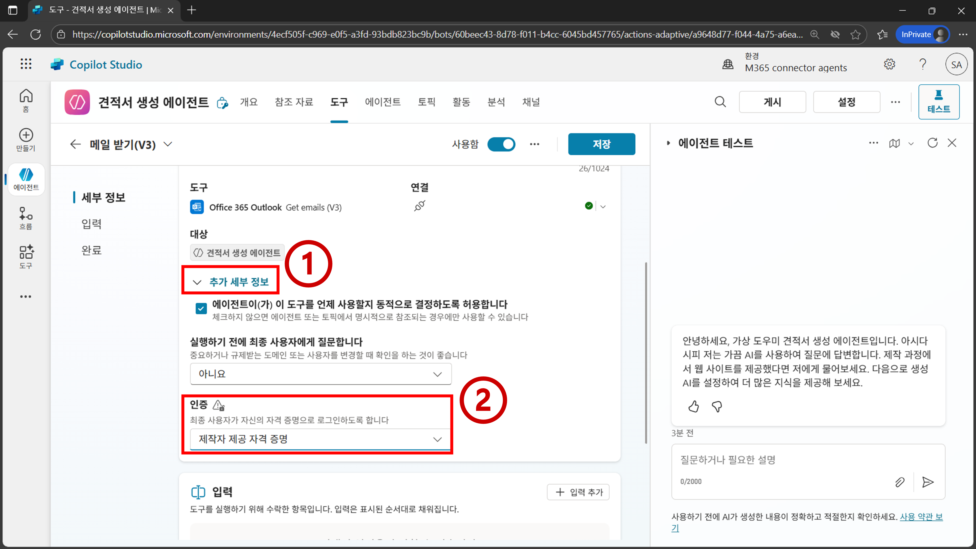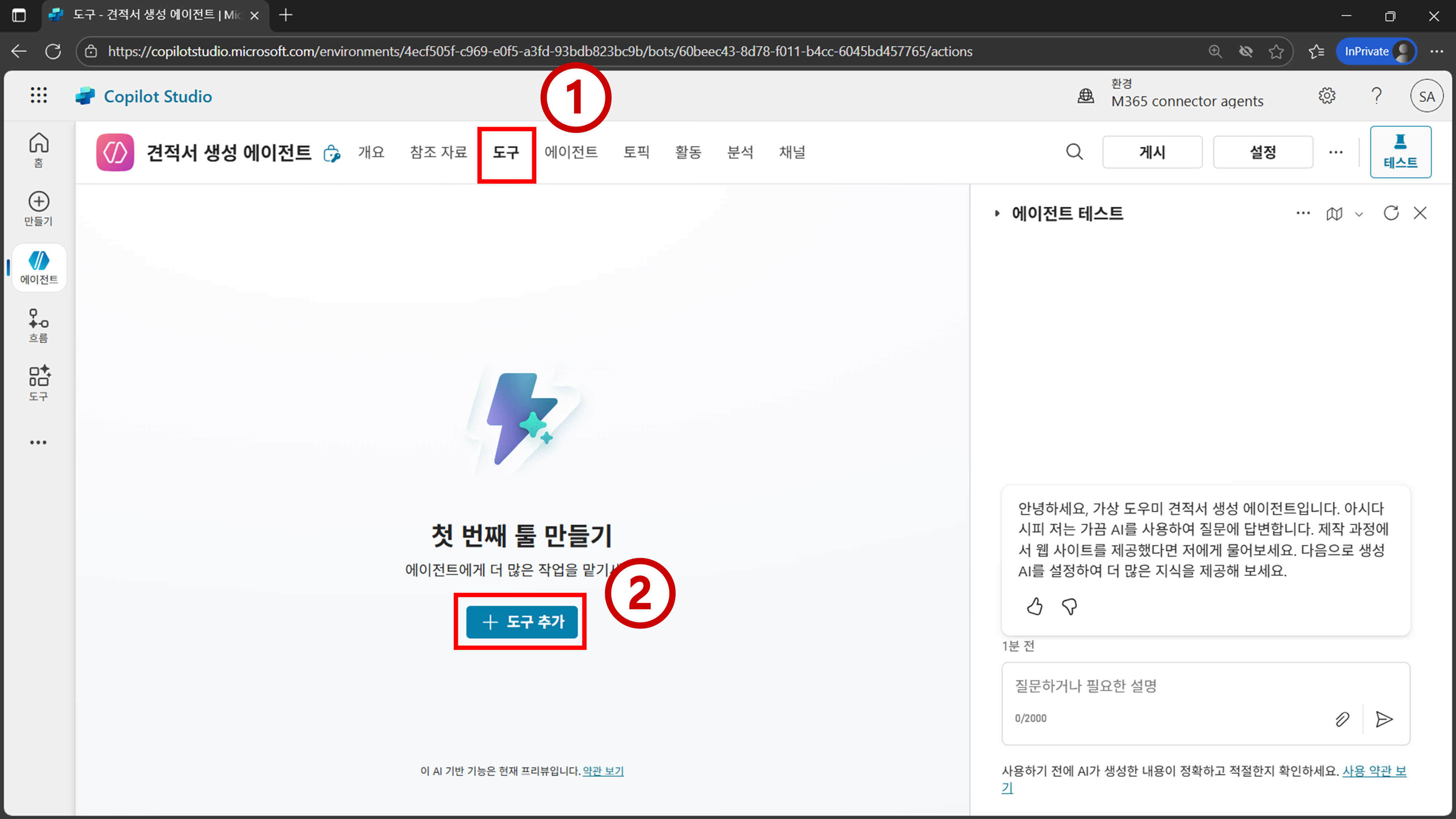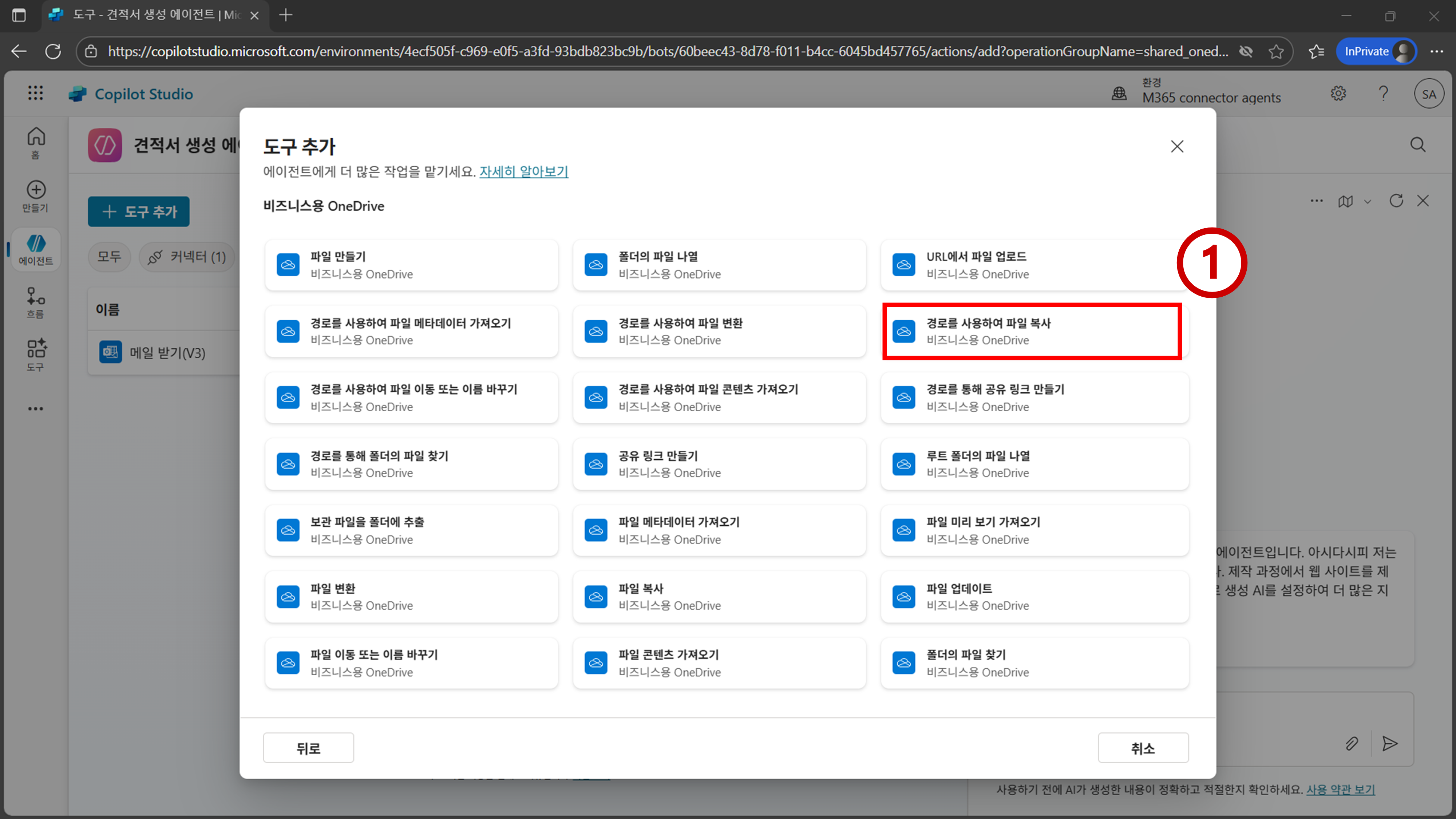 완료 > 실행 후를특정 응답 보내기(아래에 지정)으로 설정한다.표시할 메시지에이메일 불러오기 완료를 입력한다. 그리고저장을 클릭한다.도구 > 도구 추가를 클릭한다.비지니스용 OneDrive를 클릭한다.경로를 사용하여 파일 복사를 클릭한다.연결에 앞서 실습 환경 설정 단계에서 구축해둔 본인의 이메일로된 연결이 자동 선택된 것을 확인한다.추가 및 구성을 클릭한다.추가 세부 정보 > 인증값을제작자 제공 자격 증명으로 설정한다.File Path를사용자 지정 값으로 설정하고폴더아이콘을 클릭한다.Root > 코파일럿 에이전트 교육 개인 폴더 > 프로젝트3 > 템플릿 > 견적서_템플릿_엑셀.xlsx파일을 선택한다.Destination File Path를사용자 지정 값으로 설정한 뒤값에는/코파일럿 에이전트 교육 개인 폴더/프로젝트3/견적서/견적서.xlsx를 입력한다.완료 > 실행 후를특정 응답 보내기(아래에 지정)으로 설정한다.표시할 메시지에견적서 복사 완료를 입력한다. 그리고저장을 클릭한다.도구 > 도구 추가를 클릭한다.Excel Online(Business)를 클릭한다.테이블에 행 추가를 클릭한다.연결에 앞서 실습 환경 설정 단계에서 구축해둔 본인의 이메일로된 연결이 자동 선택된 것을 확인한다.추가 및 구성을 클릭한다.추가 세부 정보 > 인증값을제작자 제공 자격 증명으로 설정한다.Location을사용자 지정 값으로 설정한다.값을OneDrive for Business로 설정한다.Document Library를사용자 지정 값,OneDrive(또는문서로 이름이 되어 있을 수 있음)로 설정한다.File을사용자 지정 값으로 설정한 뒤폴더아이콘을 클릭한다.코파일럿 에이전트 교육 개인 폴더 > 프로젝트3 > 템플릿 > 견적서_템플릿_엑셀.xlsx을 선택한다.Table을