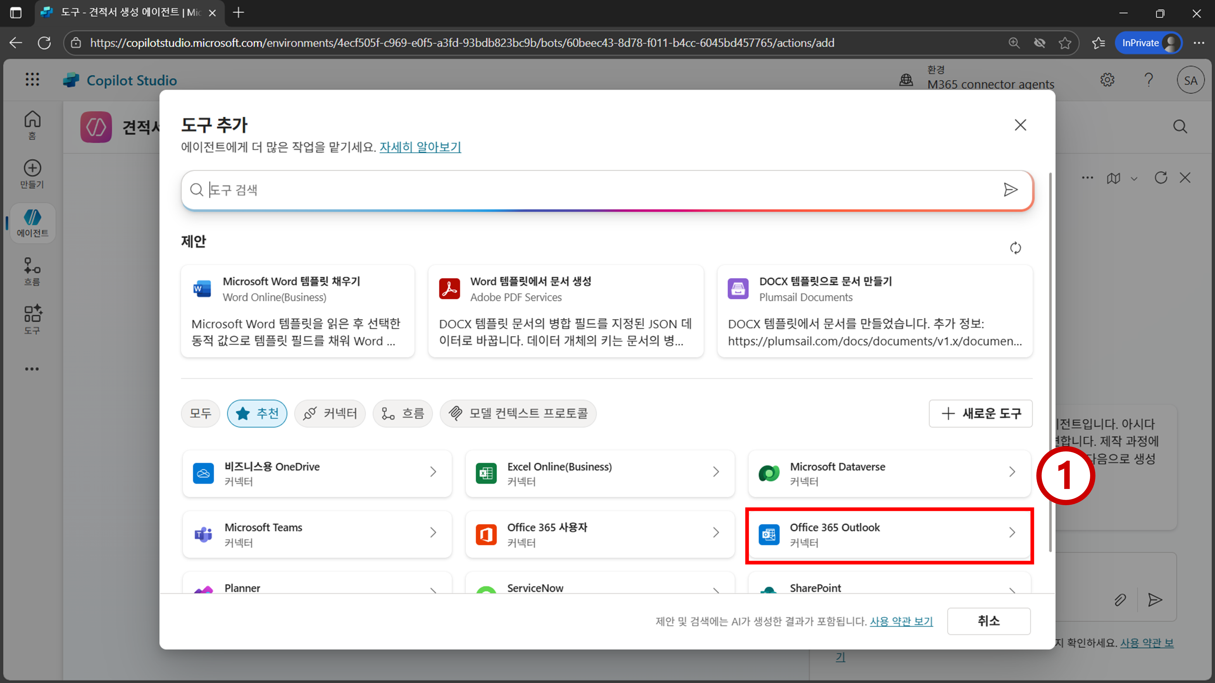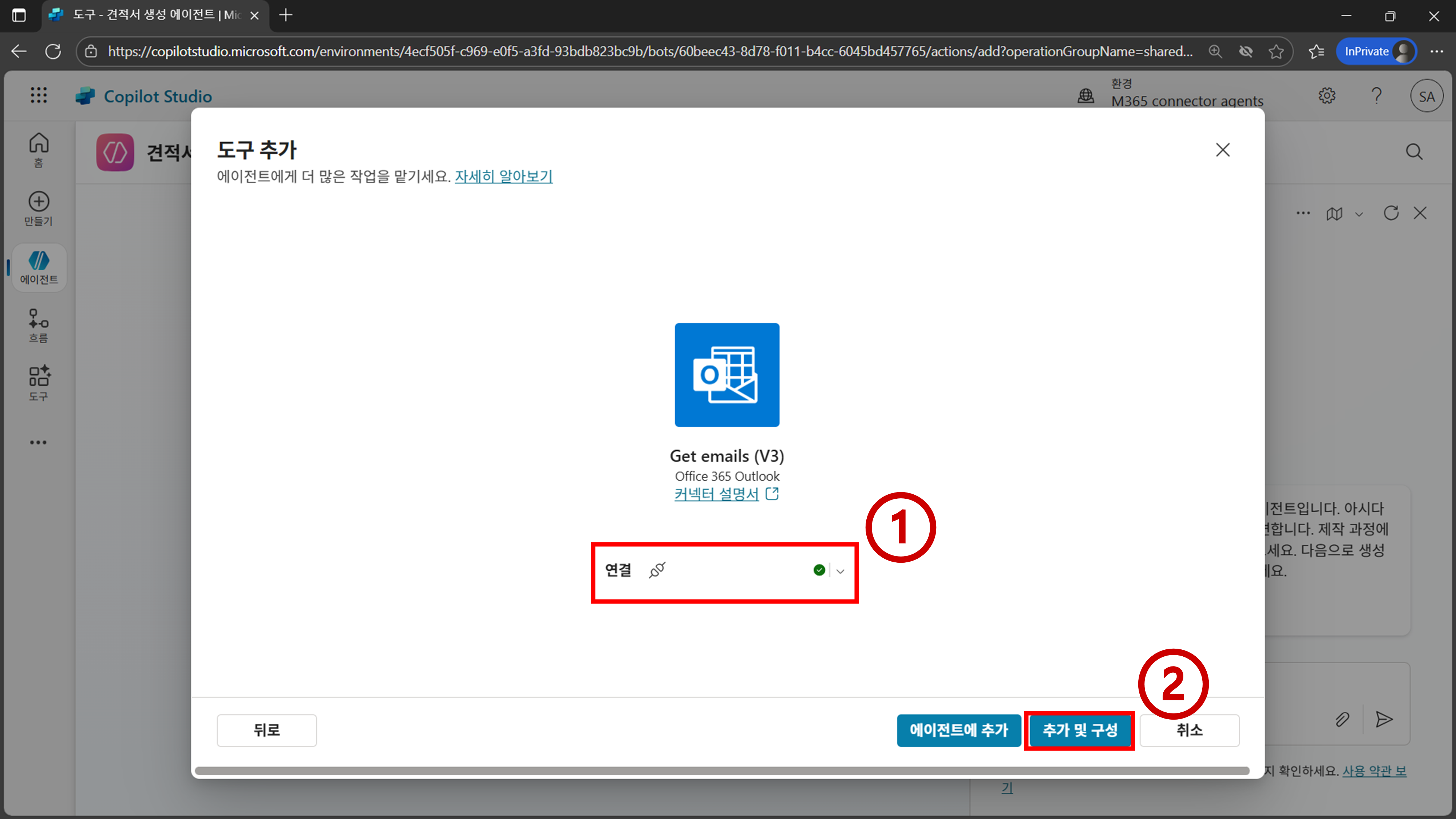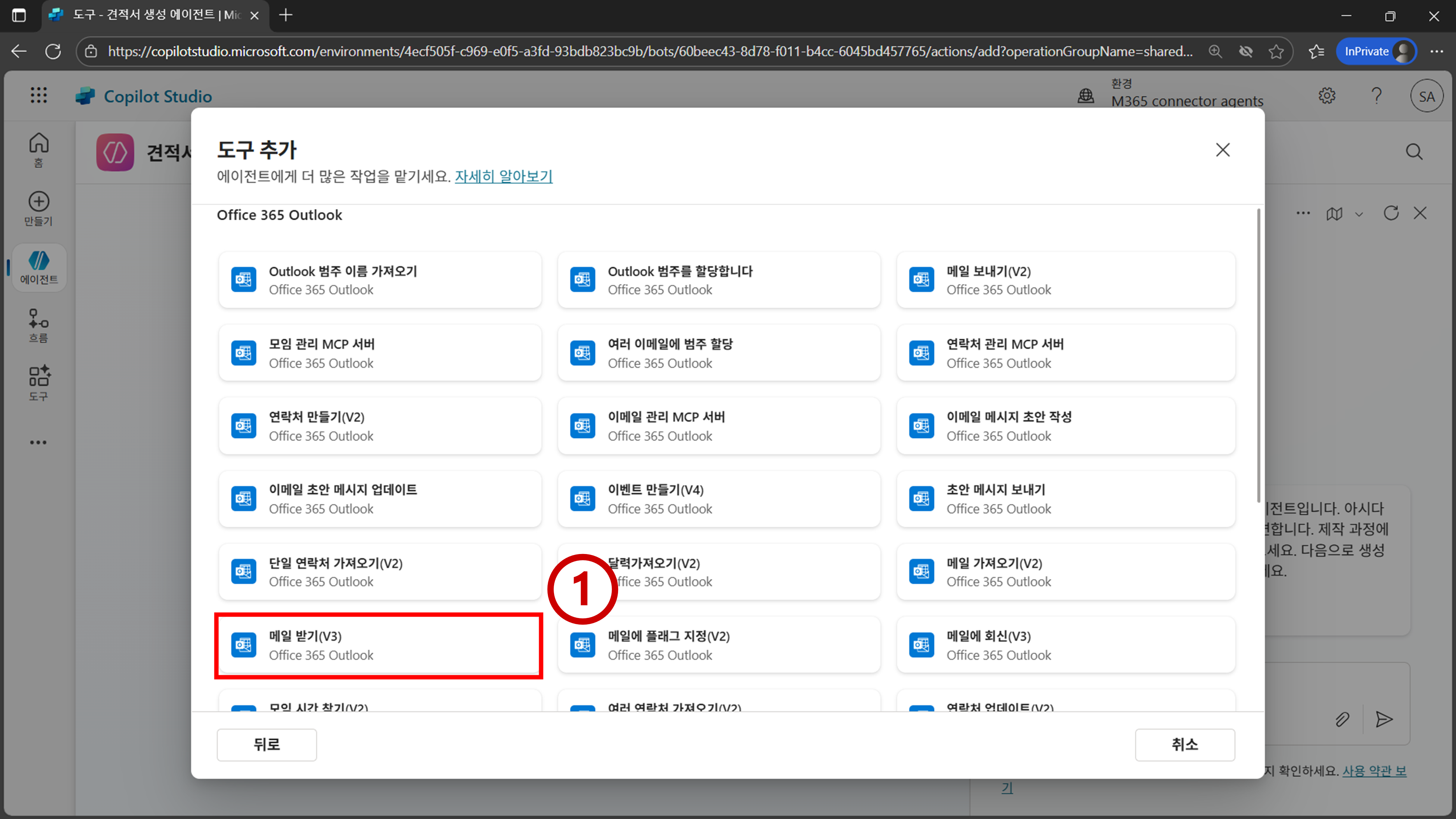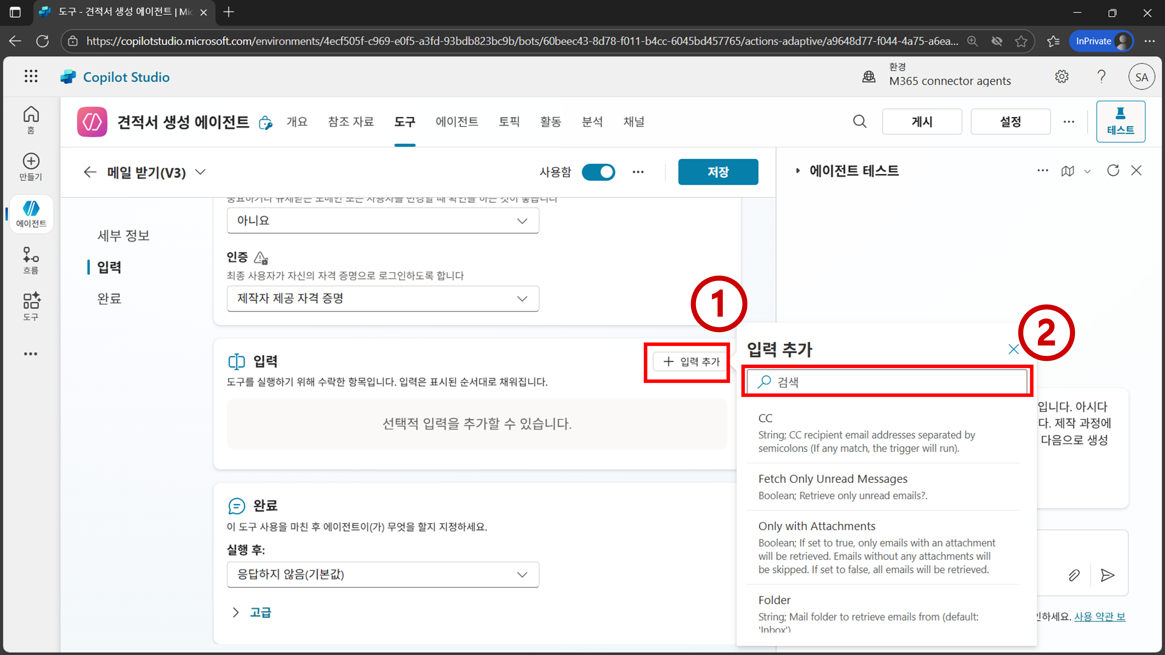 웹 검색을사용 안 함으로 설정한다. 그리고 우측 상단에만들기를 클릭한다.도구 > 도구 추가를 클릭한다.Office 365 Outlook을 클릭한다.메일 받기(V3)을 클릭한다.연결에 앞서 실습 환경 설정 단계에서 구축해둔 본인의 이메일로된 연결이 자동 선택된 것을 확인한다.추가 및 구성을 클릭한다.메일 받기(V3)작업의설명값을해당 작업을 사용해서 이메일을 가지고 와 주세요로 수정한다.