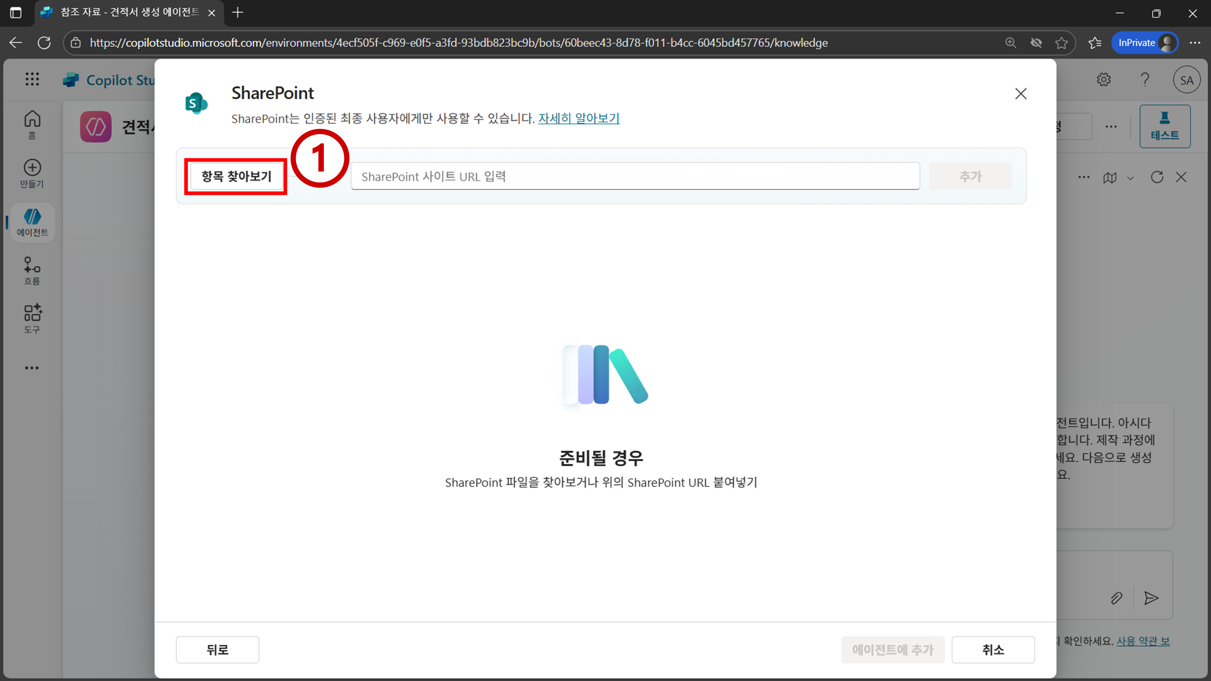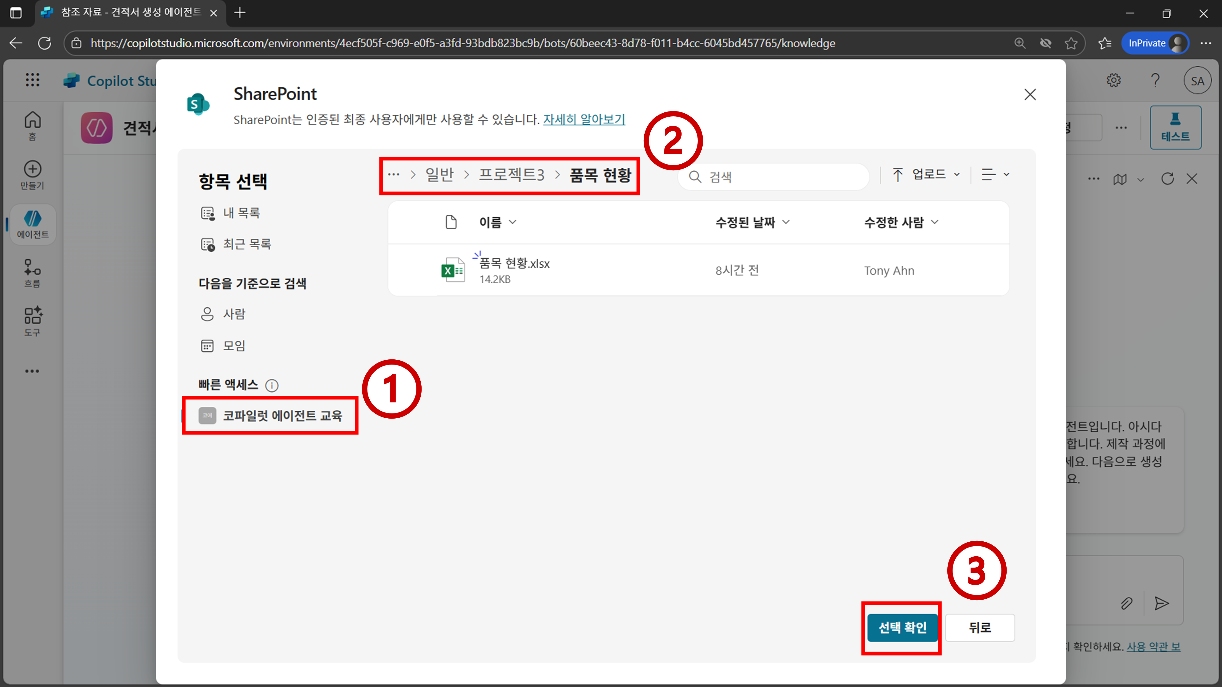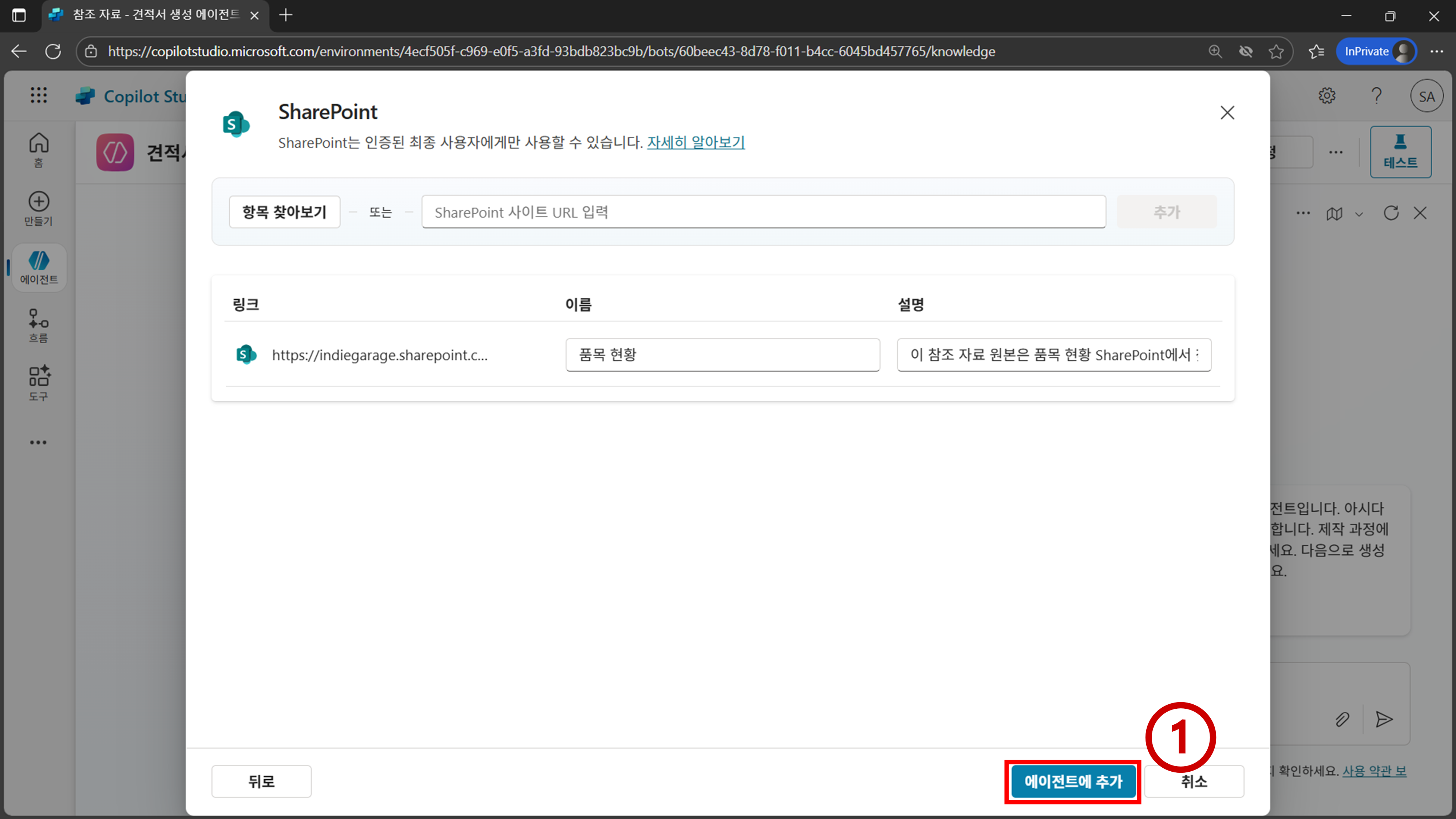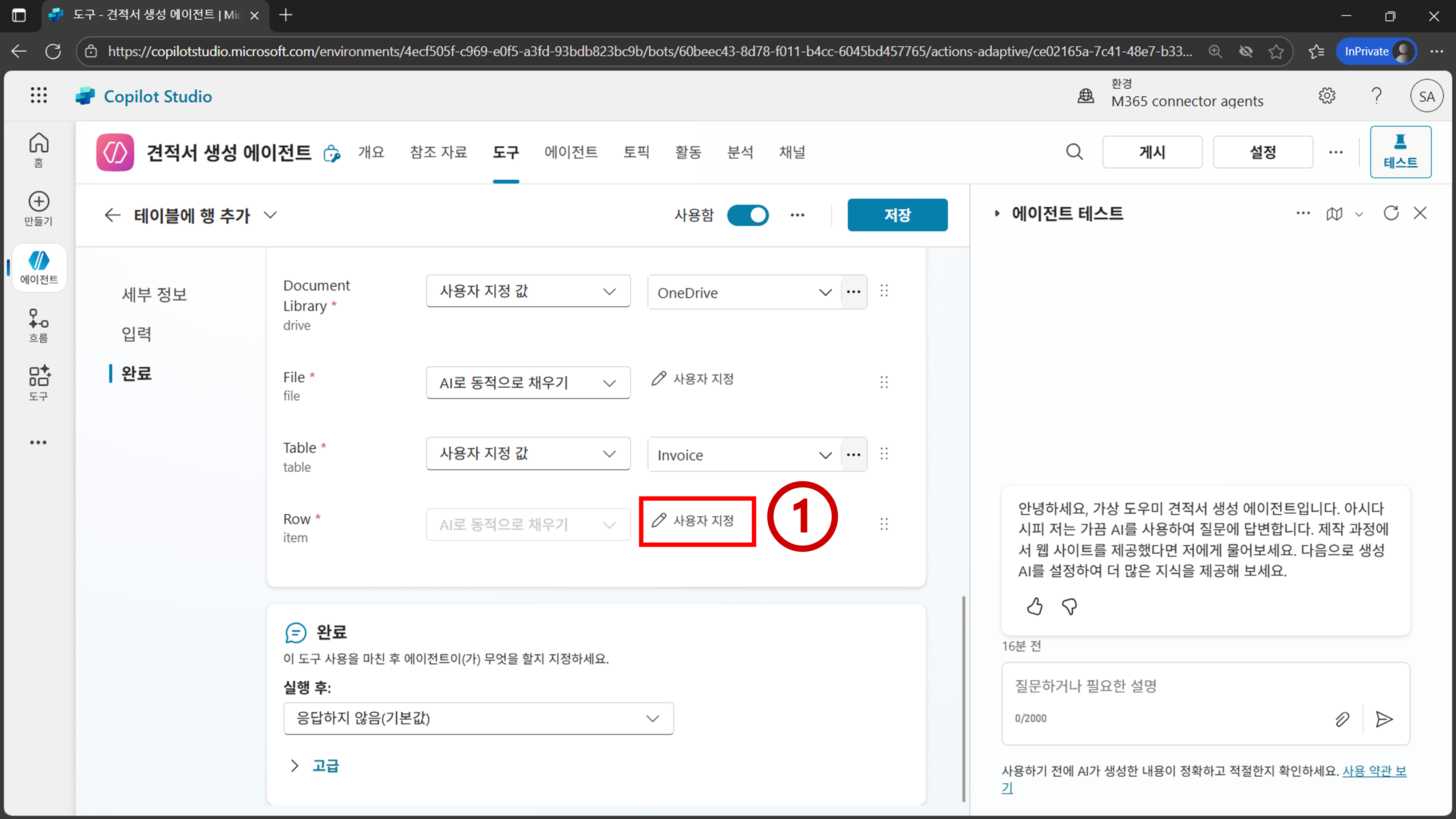 Row의사용자 지정을 클릭한다.설명란에 project3-snippets.txt 파일 내 35번 값을 입력한다. 그리고X를 클릭한다.완료 > 실행 후를특정 응답 보내기(아래에 지정)으로 설정한다.표시할 메시지에견적서 품목 한 항목 추가 완료를 입력한 뒤저장을 클릭한다.참조 자료 > 참조 자료 추가를 클릭한다.SharePoint를 클릭한다.항목 찾아보기를 클릭한다.코파일럿 에이전트 교육쉐어포인트로 이동한 뒤일반 > 프로젝트3 > 품목 현황폴더를 선택하고선택 확인을 클릭한다.