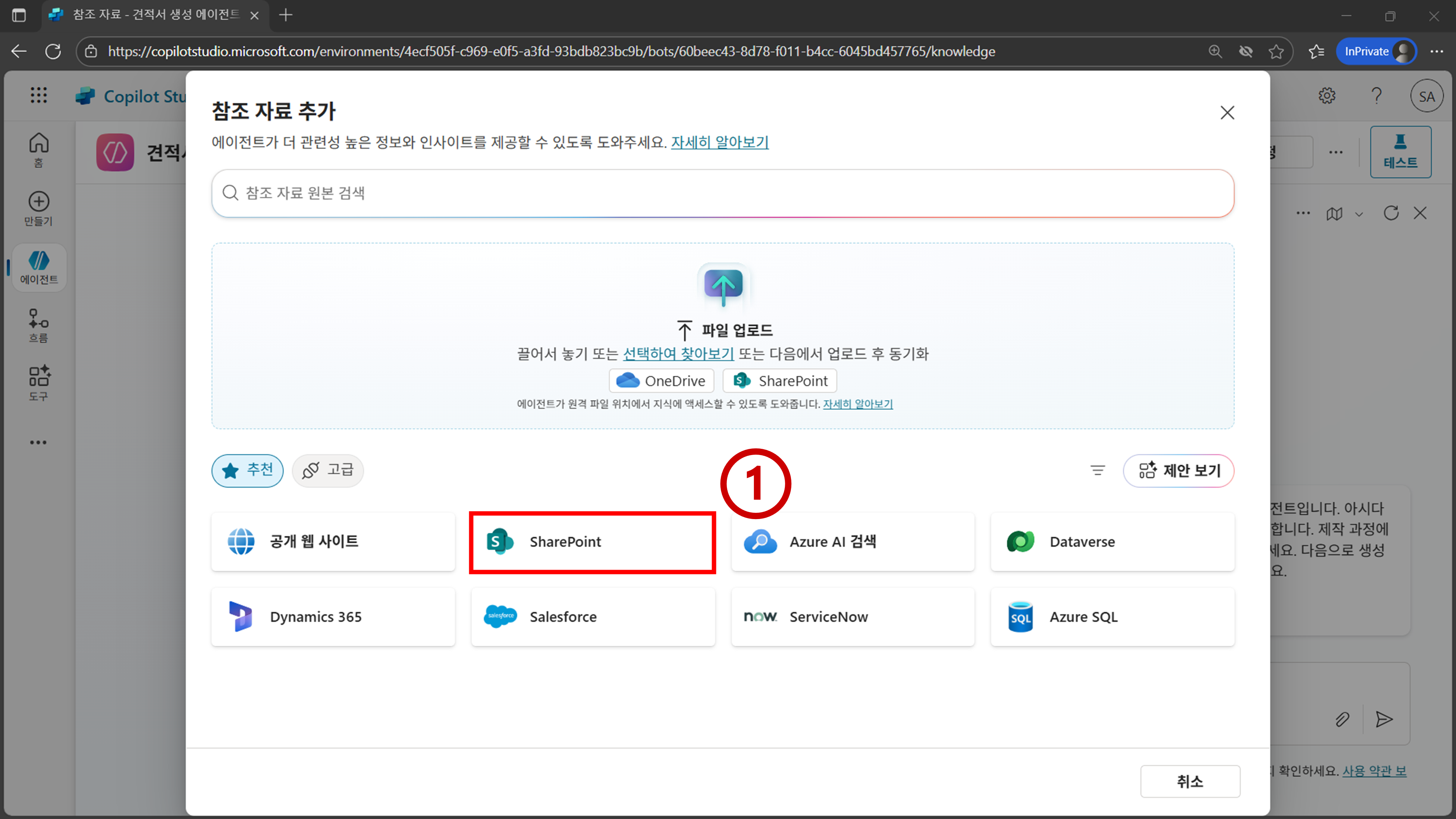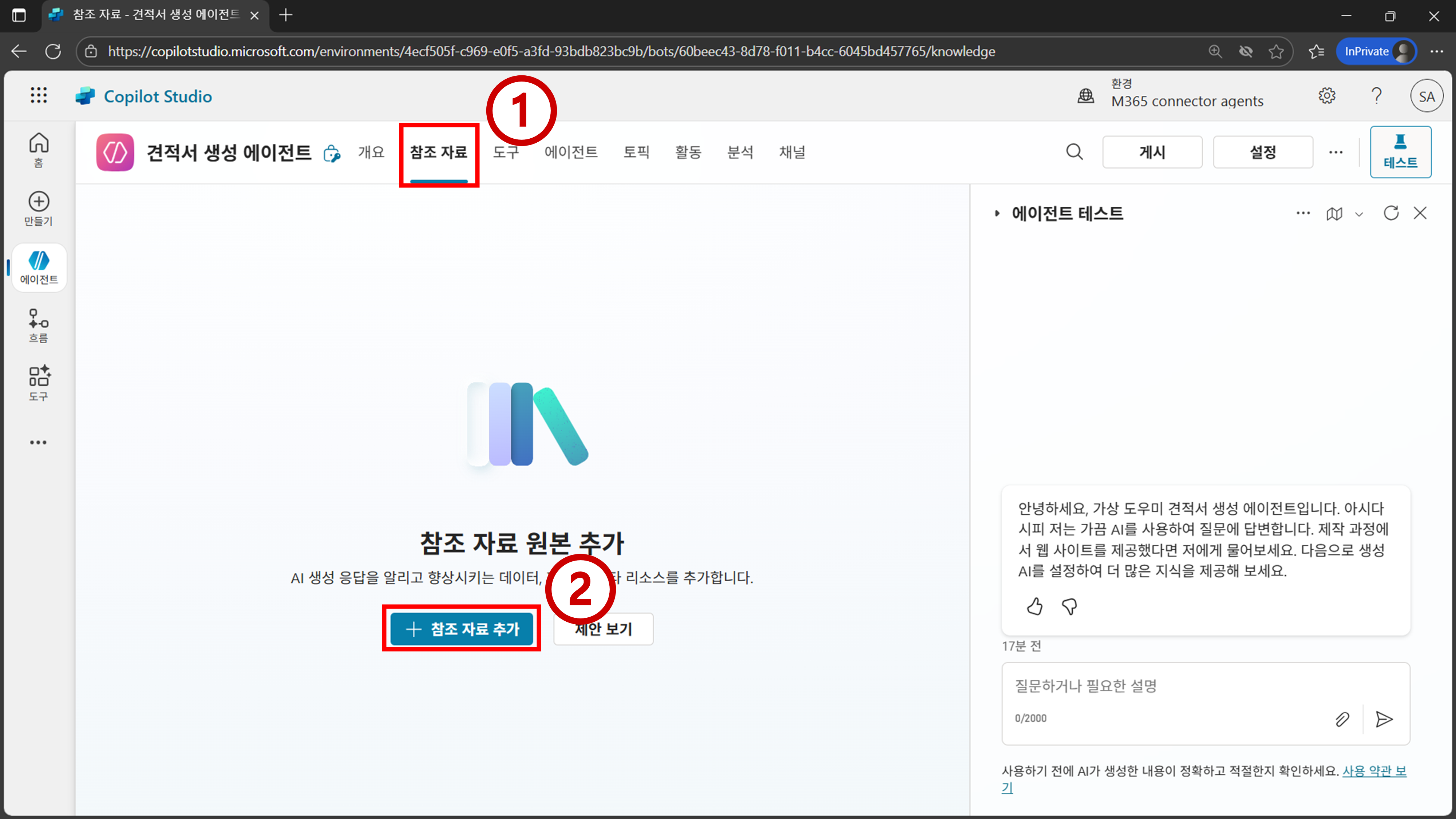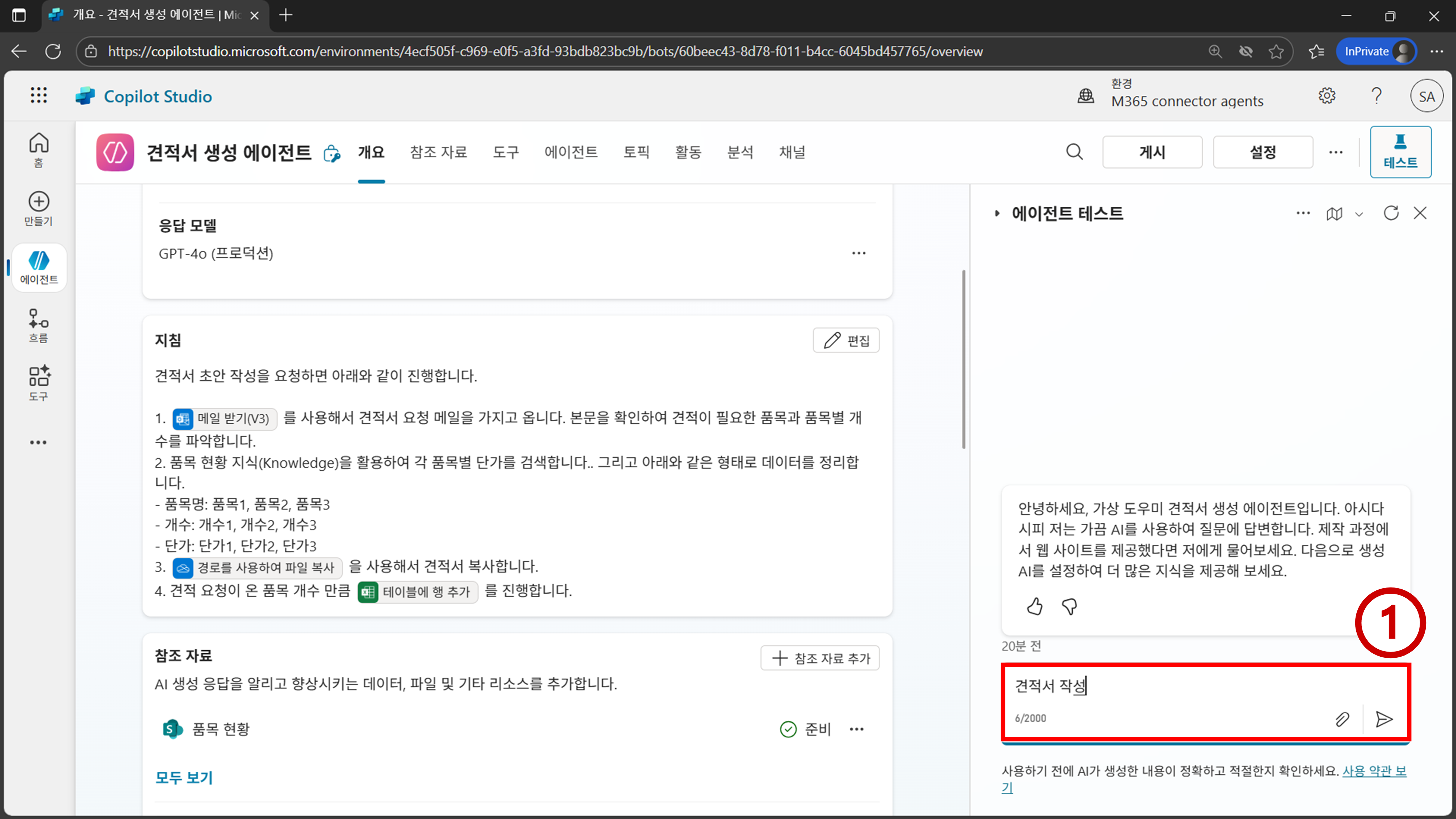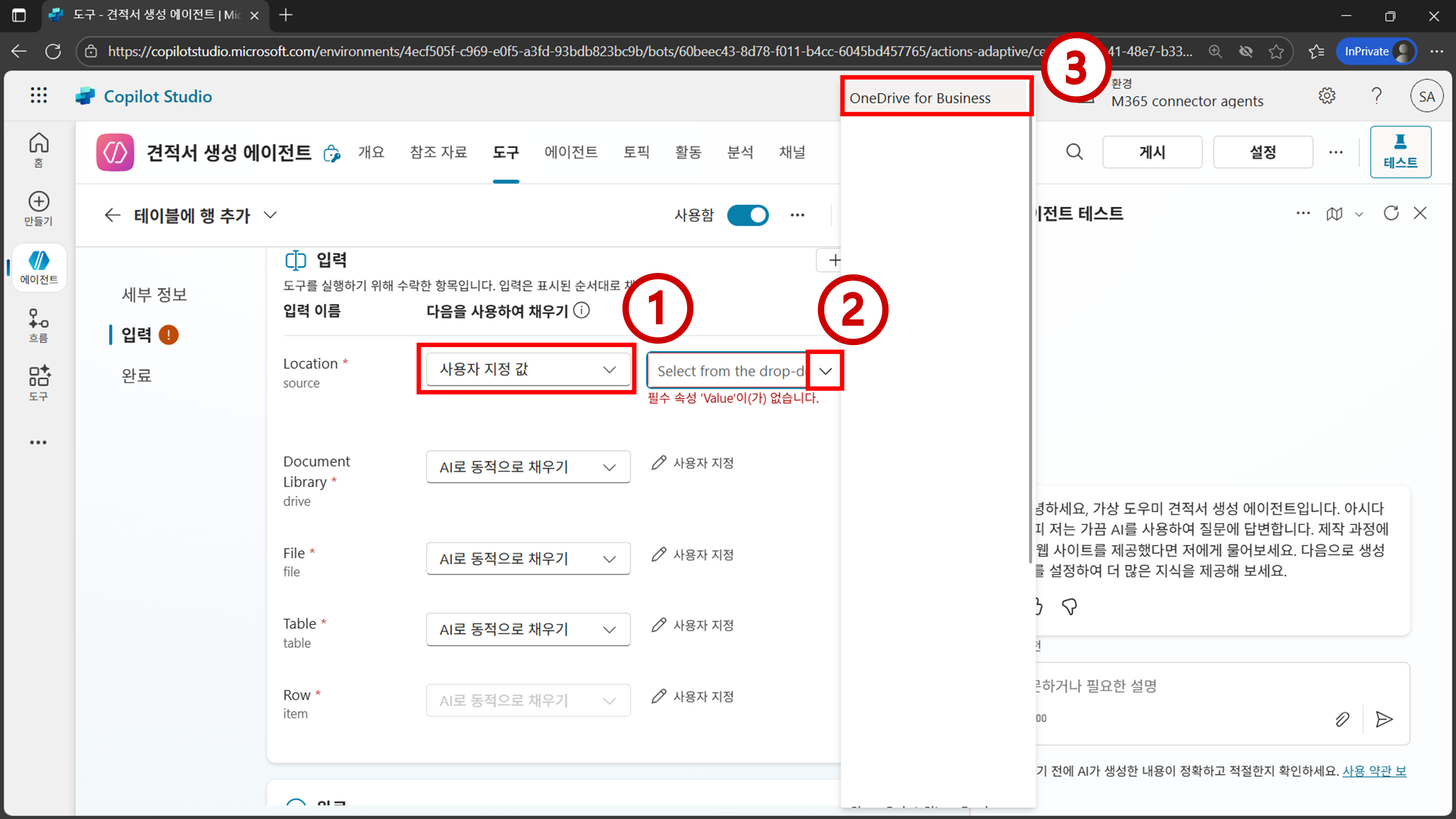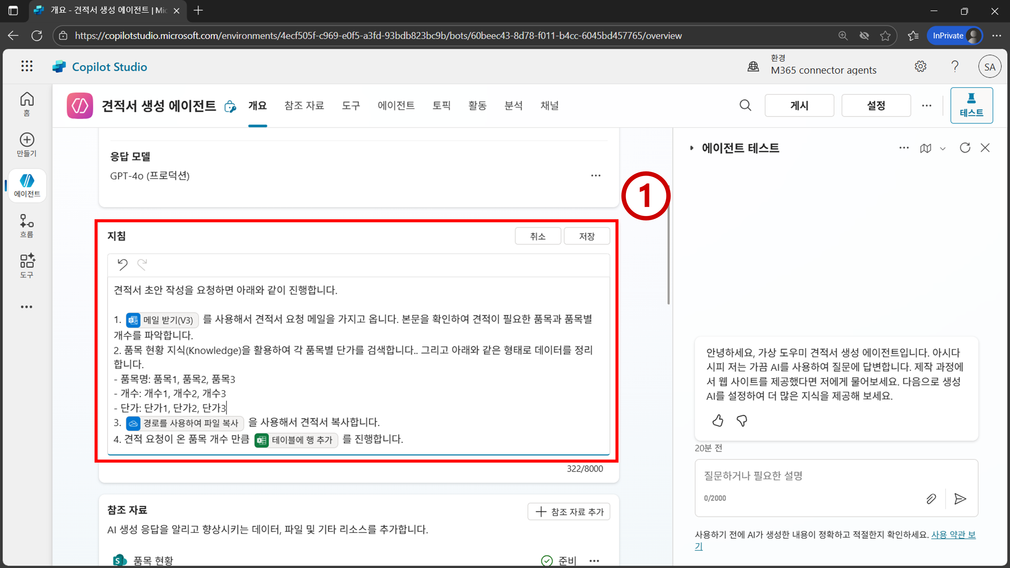 Row의사용자 지정을 클릭한다.설명란에 project3-snippets.txt 파일 내 35번 값을 입력한다. 그리고X를 클릭한다.완료 > 실행 후를특정 응답 보내기(아래에 지정)으로 설정한다.표시할 메시지에견적서 품목 한 항목 추가 완료를 입력한 뒤저장을 클릭한다.참조 자료 > 참조 자료 추가를 클릭한다.SharePoint를 클릭한다.항목 찾아보기를 클릭한다.코파일럿 에이전트 교육쉐어포인트로 이동한 뒤일반 > 프로젝트3 > 품목 현황폴더를 선택하고선택 확인을 클릭한다.
