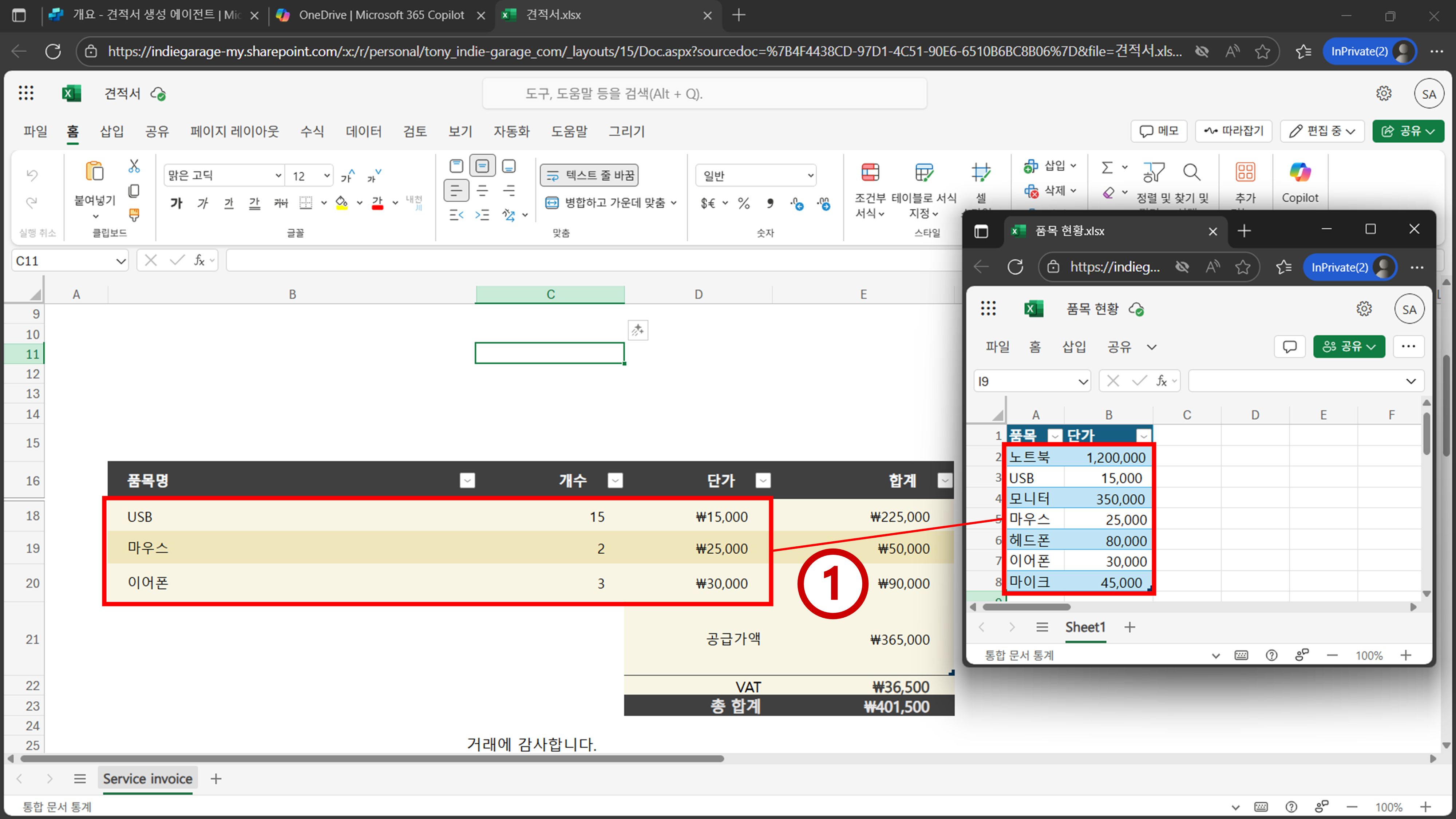 코파일럿 에이전트 교육쉐어포인트 사이트에 있는품목 현황.xlsx파일 내에 있는 단가들로 적절하게 채워진 것을 확인할 수 있다. 그 외 합계, 공급가액, VAT 등의 값들은 엑셀 수식으로 채워진 것이다.